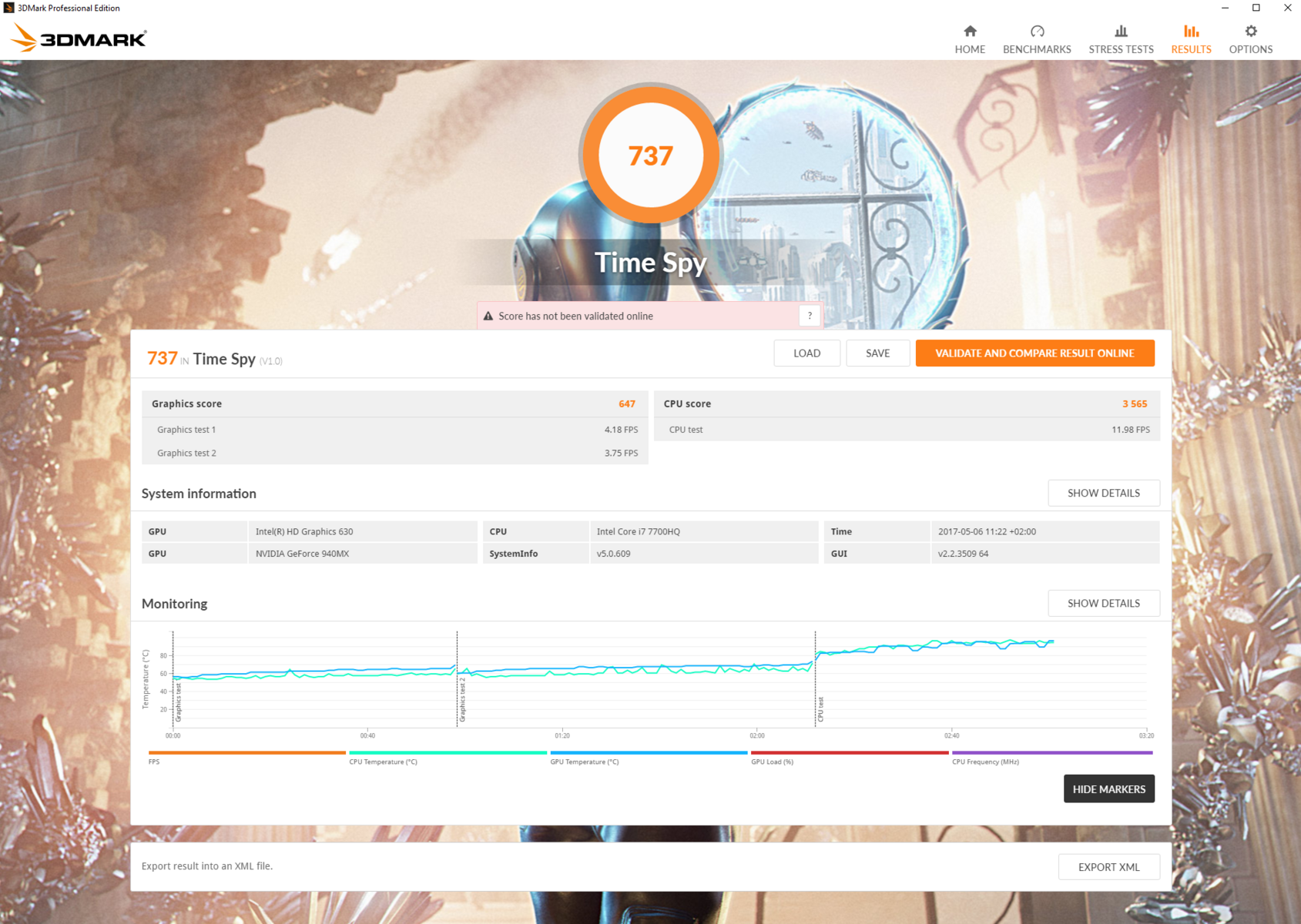 At 82 °C (180 °F), the Nvidia GeForce 940MX does not really stay very cool and clocks at a continuous 1050 MHz during the test. If both programs are run at the same time, it creates hard work for the fan. Not surprisingly, at a maximum of 98 °C (208 °F), the CPU temperatures remain at the same level as before. The thermal load of the processor now also results in a GPU temperature that at 89 °C (192 °F) is considerably warmer than before and therefore the GPU needs to be throttled. Under this constant load, the clock speed is still acceptable at 1000 MHz. Right after the load test, we ran 3DMark 11 again, in order to test which disadvantages the continuous load brings to the results. The result is slightly surprising, since we cannot find a measurable disadvantage. Still, in our opinion the cooling system is overtaxed and the manufacturer should rethink it.
