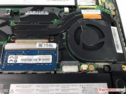 Once inside you see the two lithium-ion batteries, the single DDR4-RAM module, the M.2-SSD as well as the communication modules. Our test model is also equipped with the WWAN card in addition to the Wi-Fi module, but the necessary antennas should be prepared in other SKUs as well (LTE ready). You can also clean the fan.