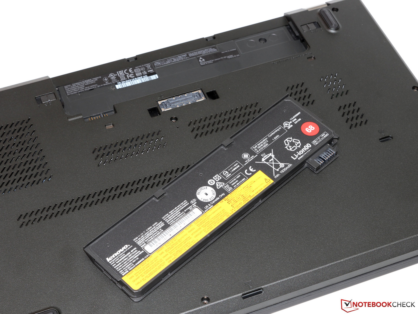 Although 7.5 hours are still excellent compared to the competitors, compared to the T560-20FH001FGE, the battery life is significantly shorter, particularly during Wi-Fi surfing (150 cd/m²). By the way, if you replace the 23-Wh battery on the rear side with the optional 72-Wh battery, you can increase the battery life by 70%. In combination with the internal 44-Wh battery, the total battery capacity increases from 67 to huge 116 Wh.