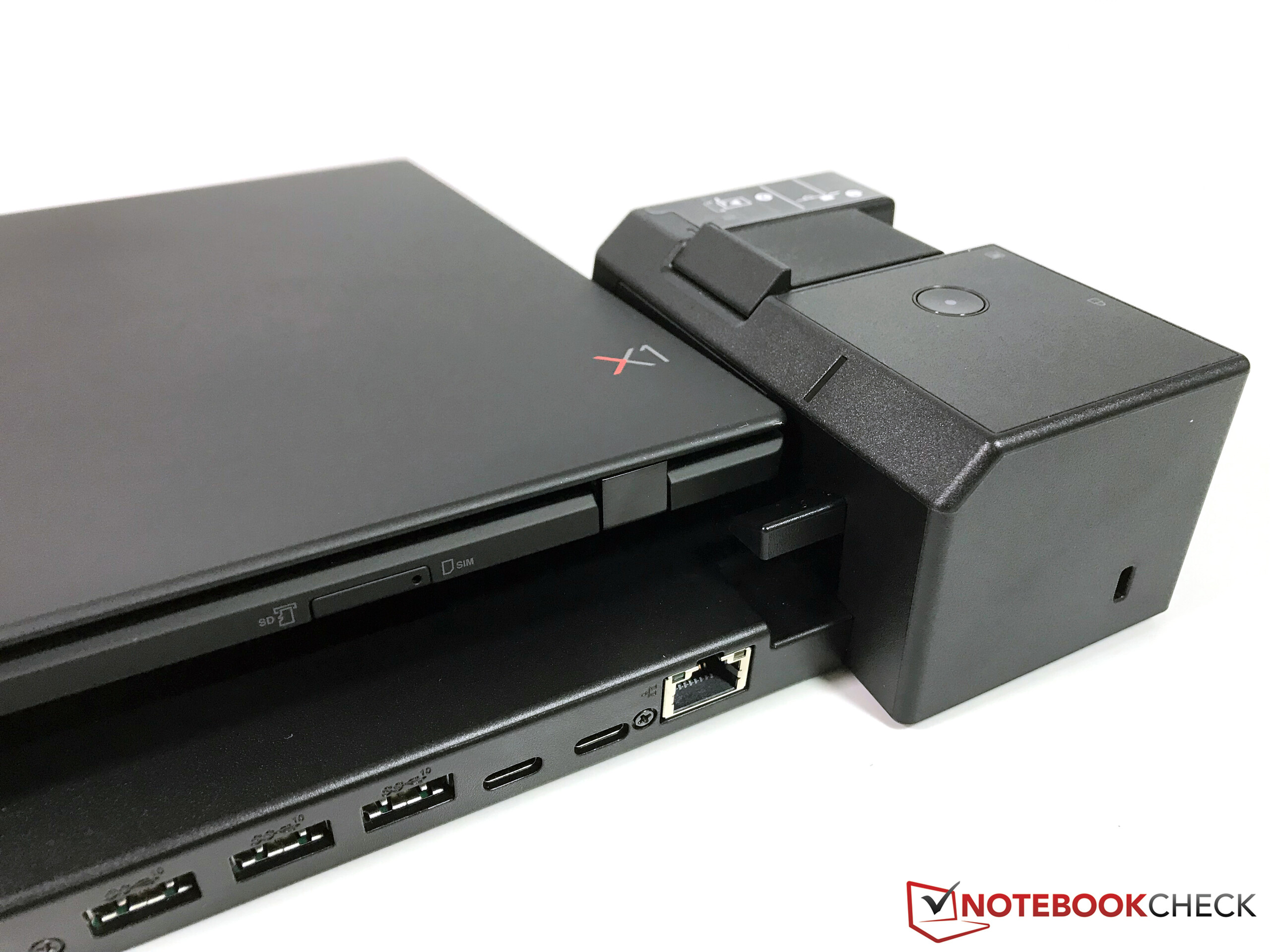 The 2017 ThinkPad X1 Carbon was already compatible with USB-C and Thunderbolt docking stations. Most 2018 ThinkPads are equipped with the new Side-Dock connector, which obviously means new docking stations as well. These new models are very similar to the old models, and we already had the chance to take a look at the new ThinkPad Ultra Docking Station, which is the most expensive option out of three new versions (Basic, Pro & Ultra) at a price of 320 Euros (~$397). You put your ThinkPad onto the docking station (hence the new indentations at the bottom) before you slide the connector from the docking station (via lever) into the ThinkPad.