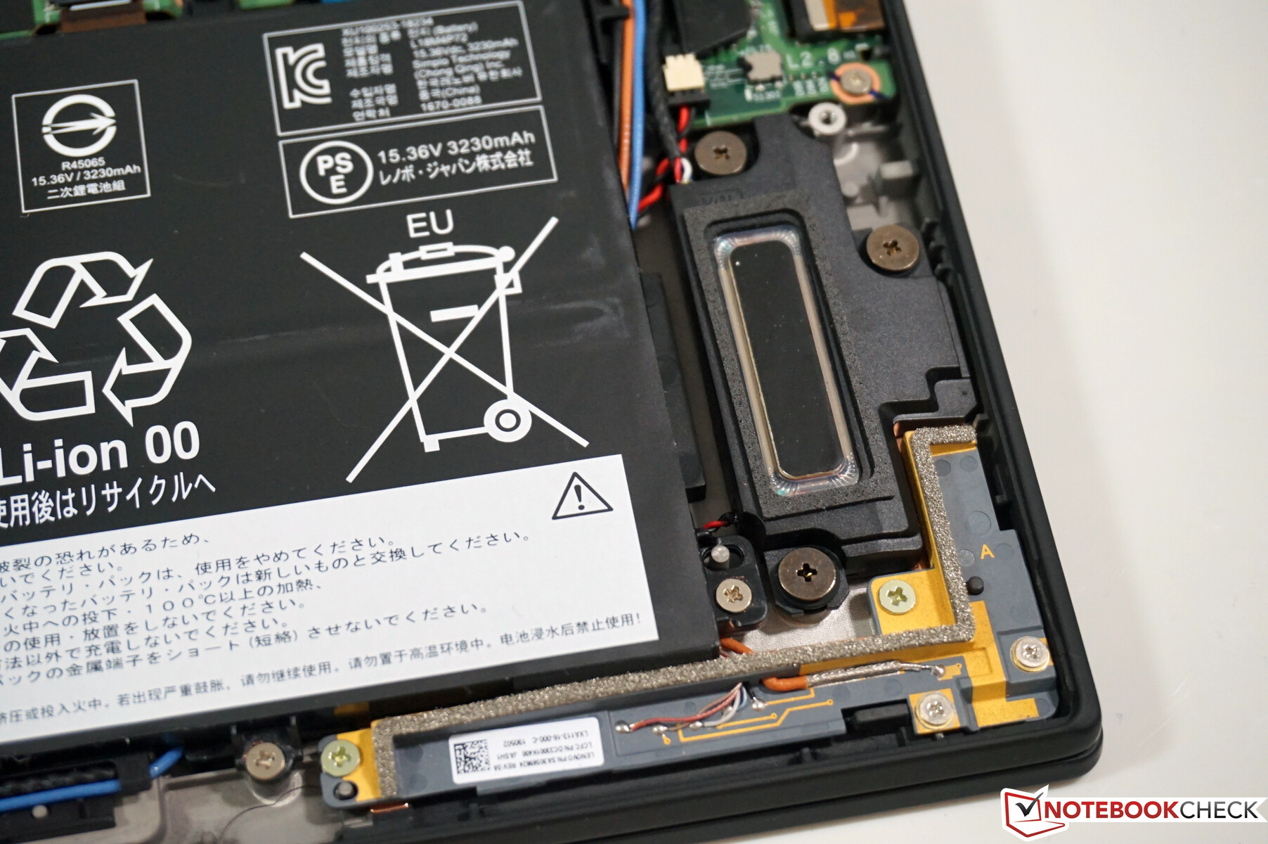 The biggest difference between the old and the new ThinkPad X1 Carbon is the speaker system, which is certainly a surprise for a business laptop. The two 1W modules from the 2018 X1 Carbon have been replaced by a total of four speakers and Lenovo advertises a Dolby Atmos system. The two speakers in the front area of the bottom are now more powerful (2W each) and they are supported by two additional modules (0.8W each) above the keyboard.