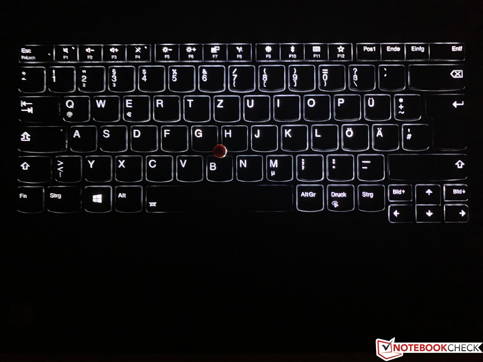 The keyboard of the current ThinkPad X1 Carbon 2019 looks identical from the outside. You still get the typical chiclet keyboard with slightly concave keys and a two-stage white background illumination, which is not completely even though (see picture below). There is unfortunately still no brightness sensor for the illumination. We still praised the input of the 2018 model thanks to its rich typing experience with a comparatively long key travel, which is not a matter of course for a slim device. In combination with the very sturdy base unit, you could enjoy an excellent typing experience with a well-defined feedback.