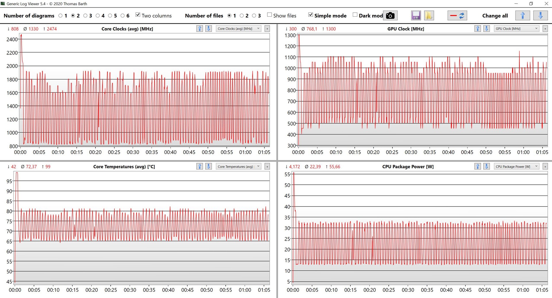 In the stress test, we experienced the same behaviour as seen with the CPU load. The CPU briefly reached 55 watts and then started to vary in an area between 12 to 34 watts and stayed there for the remainder of the test.