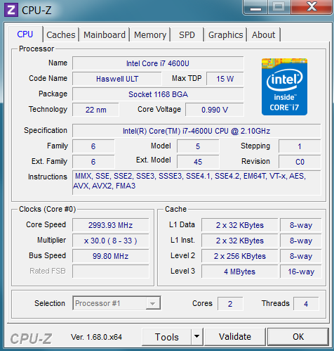 Similar to our last review, the X240 once again uses the Core i7-4600U, which is currently Intel's fastest processor with a TDP of 15 Watts. The frugal dual-core supports Hyperthreading and runs at 2.1 GHz, but can be overclocked up to 3.3 GHz (2 cores: 2.9 GHz) via Turbo Boost. Just like any Haswell processor, the i7-4600U is manufactured in a 22 nm process with FinFETs (3D transistors).