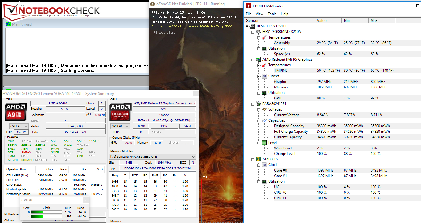 The Yoga performed our stress test (Prime95 and FurMark run for at least one hour) in the same manner in AC and battery mode. The graphics card runs at full speed (800 MHz), but the processor throttles to 1.4 GHz. The device does not heat up excessively. The temperatures remained below 40 degrees Celsius (104 Fahrenheit) on all measuring points during the stress test.