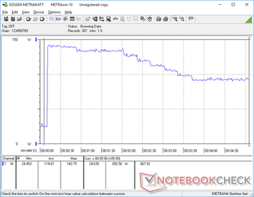 Running both Prime95 and FurMark simultaneously will draw a maximum of 143 W from the medium-sized (~14.4 x 6.3 x 3.1 cm) 135 W AC adapter. This high of a consumption is only temporary as it eventually falls and stabilizes at a lower rate over time as shown by our graphs below.