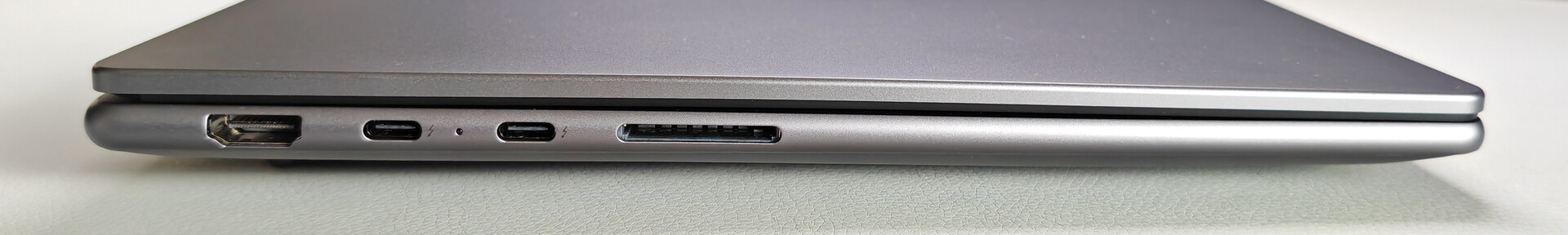 Our Intel test device is gray, but otherwise the case is no different from the AMD version. As expected, Thunderbolt 4 support is provided for the connections, but the fully-fledged SD card reader on the left-hand side is somewhat more surprising. The transfer rates are average at ~80 MB/s, but the cards cannot be inserted very far and they sit very loosely, which is why memory cards can fall out quickly.