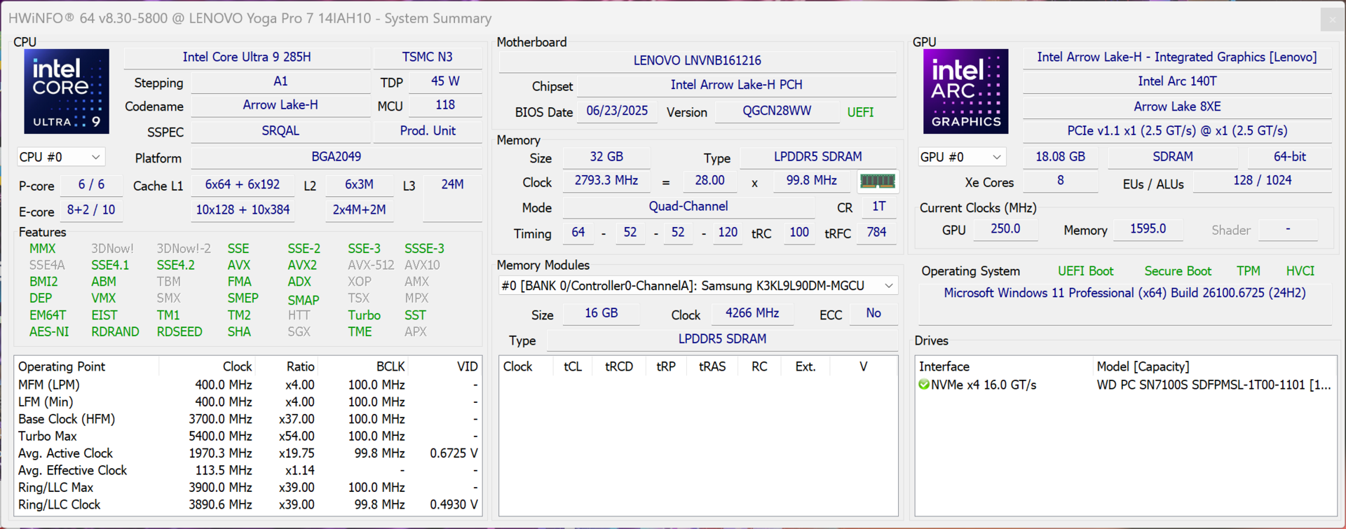 | Lenovo Yoga Pro 7 14IAH10 Ultra 9 285H, Arc 140T, WD PC SN7100S SDFPMSL-1T00-1101, OLED, 3000x1876, 14.5" | Samsung Galaxy Book5 Pro 14 940XHA Core Ultra 5 226V, Arc 130V, Samsung PM9C1 MZVL8512HELU, OLED, 2880x1800, 14" | Asus ZenBook 14 OLED UX3405CA, Ultra 7 255H Ultra 7 255H, Arc 140T, Samsung PM9C1 MZVL81T0HELB-00BTW, OLED, 1920x1200, 14" | Tuxedo Infinity Book Pro 14 Gen10 AMD Ryzen AI 9 HX 370, Radeon 890M, Crucial P3 Plus CT2000P3PSSD8 , IPS, 2880x1800, 14" | Dell 14 Premium Ultra 7 255H, Arc 140T, Kioxia BG6 KBG6AZNV1T02, OLED, 3200x2000, 14.5" | Lenovo Yoga Pro 7 14AKP G10 Ryzen AI 7 350, Radeon 860M, SK hynix PVC10 HFS001TEM4X182N, OLED, 2944x1840, 14.5" | Average Intel Arc Graphics 140T | Average of class Office | |