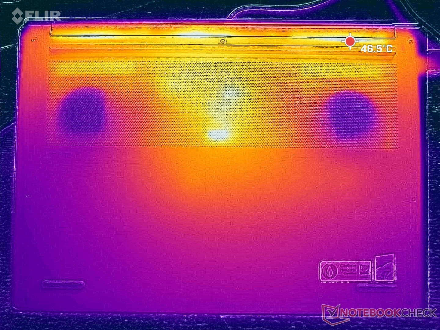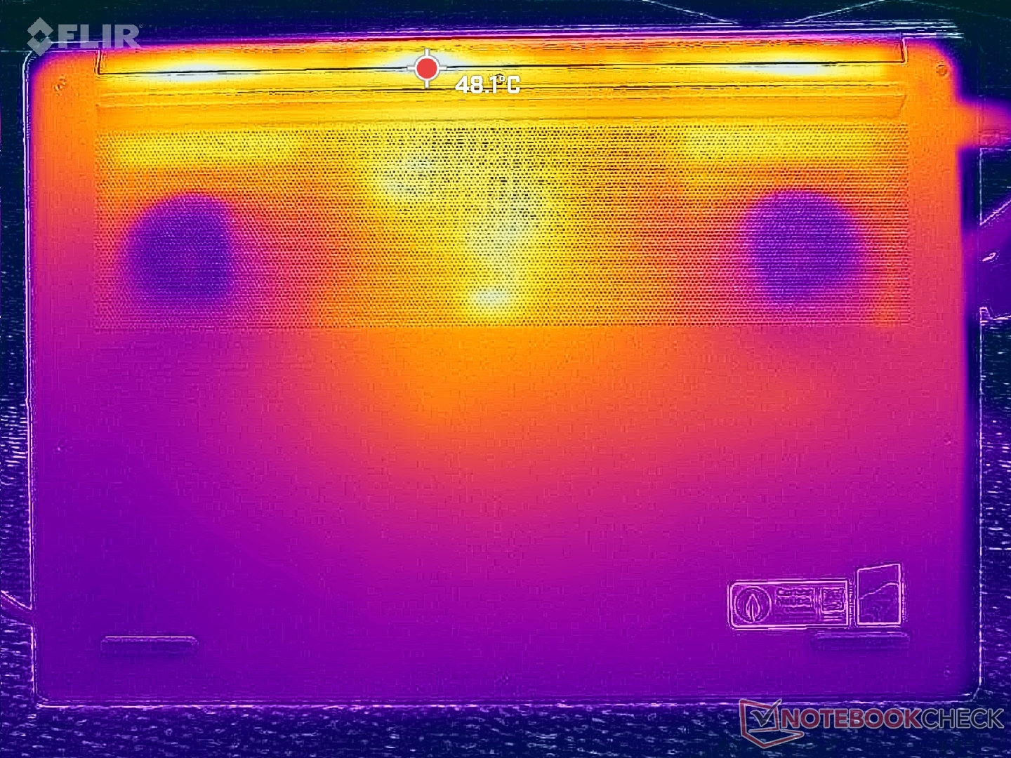 Surface temperatures when running demanding loads are noticeably cooler than what we recorded on the RTX 5070 configuration. Hot spots when idling on Cyberpunk 2077 would reach just over 35 C and 42 C on the keyboard deck and bottom cover, respectively, compared to 42 C and 46 C on the faster RTX 5070 unit.