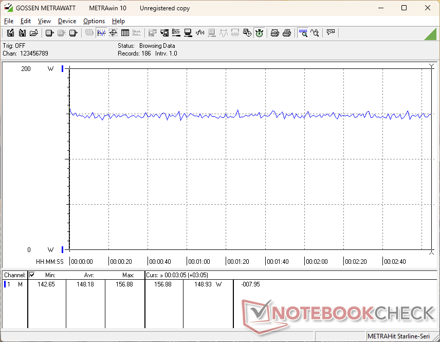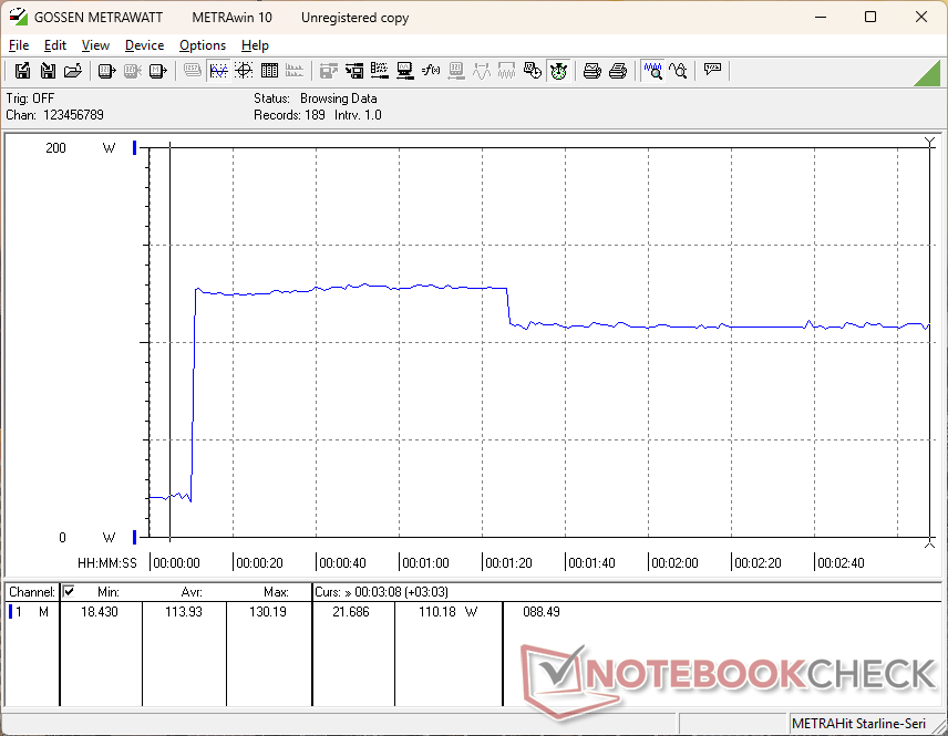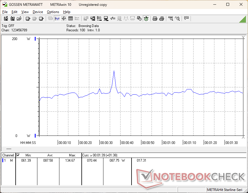 Consumption can be as low as 7 W when on iGPU mode with the screen set to minimum brightness or over 22 W if on dGPU mode and maximum brightness. When gaming, however, the system would only draw just a few watts less than the much faster RTX 5060 or 5070 options. Upgrading to the RTX 5060 configuration, for example, would draw just 6 percent more power for 20 to 30 percent faster gaming performance.