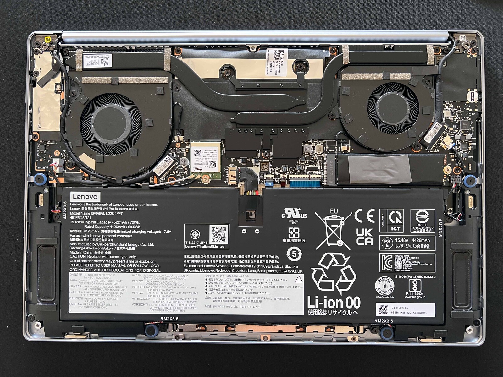 The processor Ryzen 7 7840S is exclusive for Lenovo laptops, but we did not find a difference compared to the regular Ryzen 7 7840HS. Only the minimum TDP can be set to less than 35 Watts, so Lenovo has more influence on the power profiles, which is also visible. The performance is very good in High Performance mode and the multi-core performance in particular is superior to modern Intel CPUs in this TDP range, but we also have to say that the cooling solution in the slim chassis is having a hard time with the powerful processor. If you really use the performance, the fans get loud quickly and the chassis warms up quite a bit. You can obviously use the more efficient power profiles, but a U-series processor would have been a more suitable choice for the cooling performance.