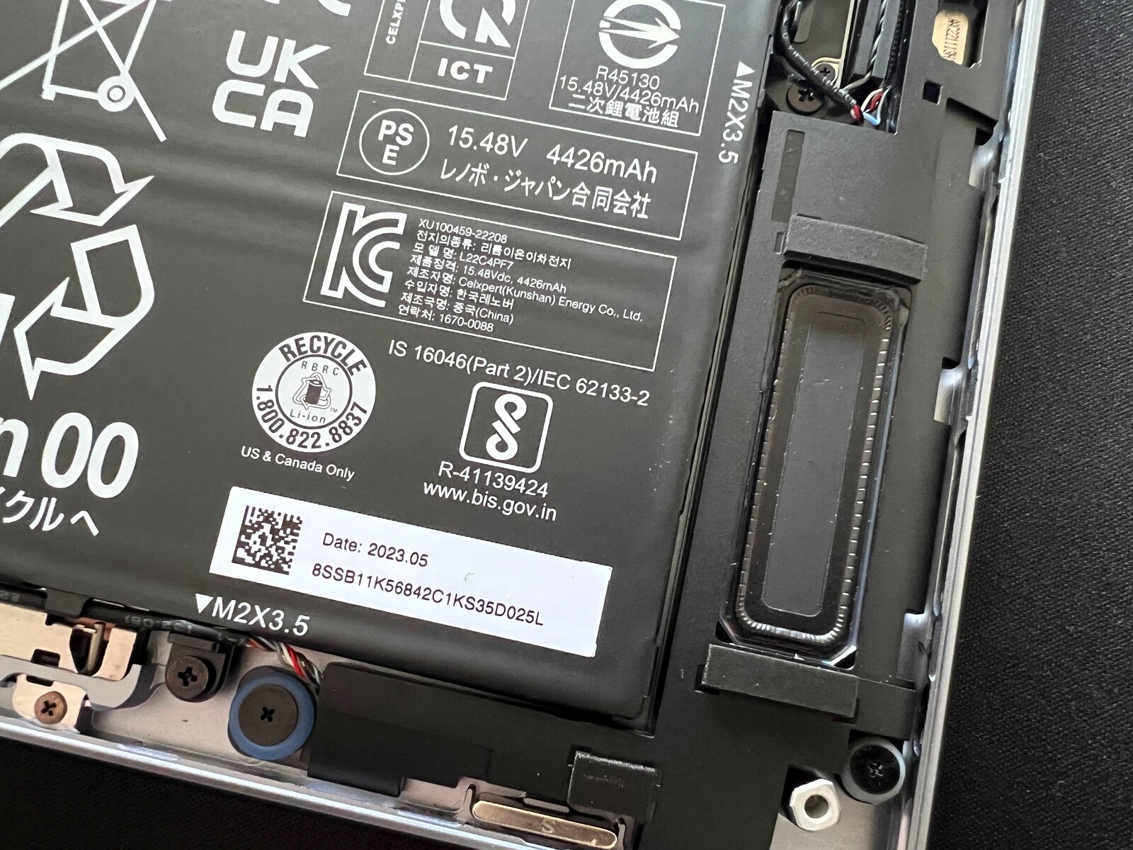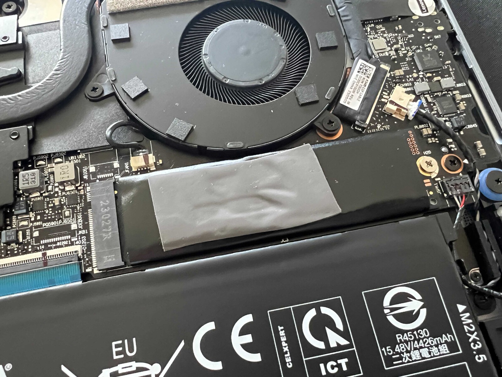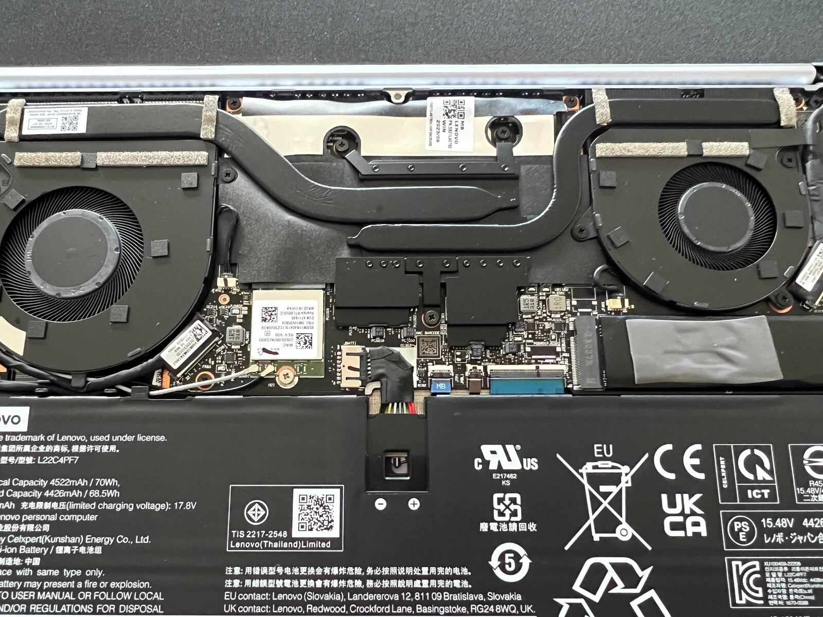 The lower panel is secured by a couple of Torx screws (T5) as well as additional plastic clips and an additional clamp, which is located in the center of the device (you can see the counter part in the upper part of the battery). This means it is not that easy to remove the panel. There is not much to do anyway besides cleaning the fans or replace the M.2-2280 SSD and the Wi-Fi module. The memory is soldered and cannot be replaced.