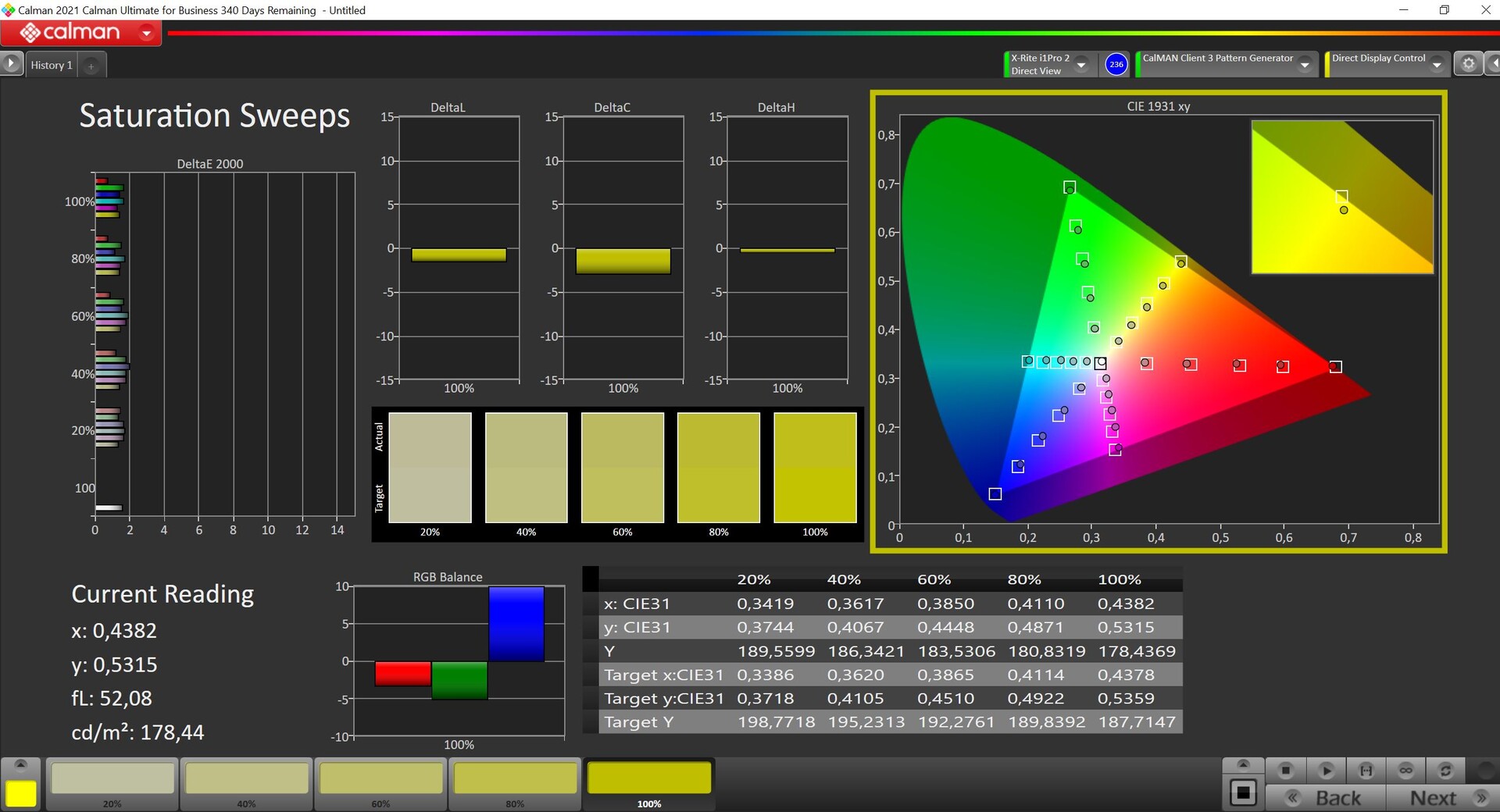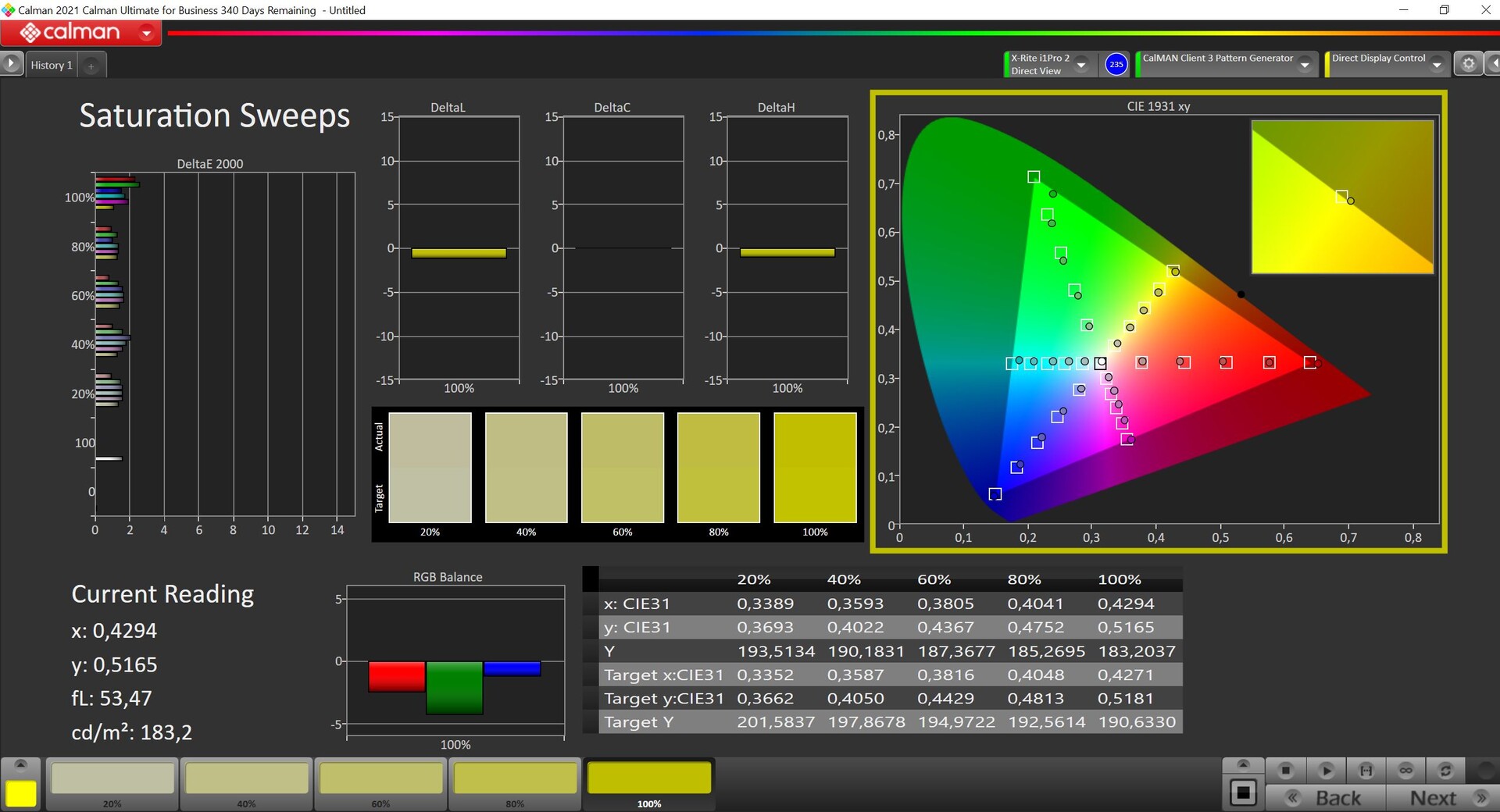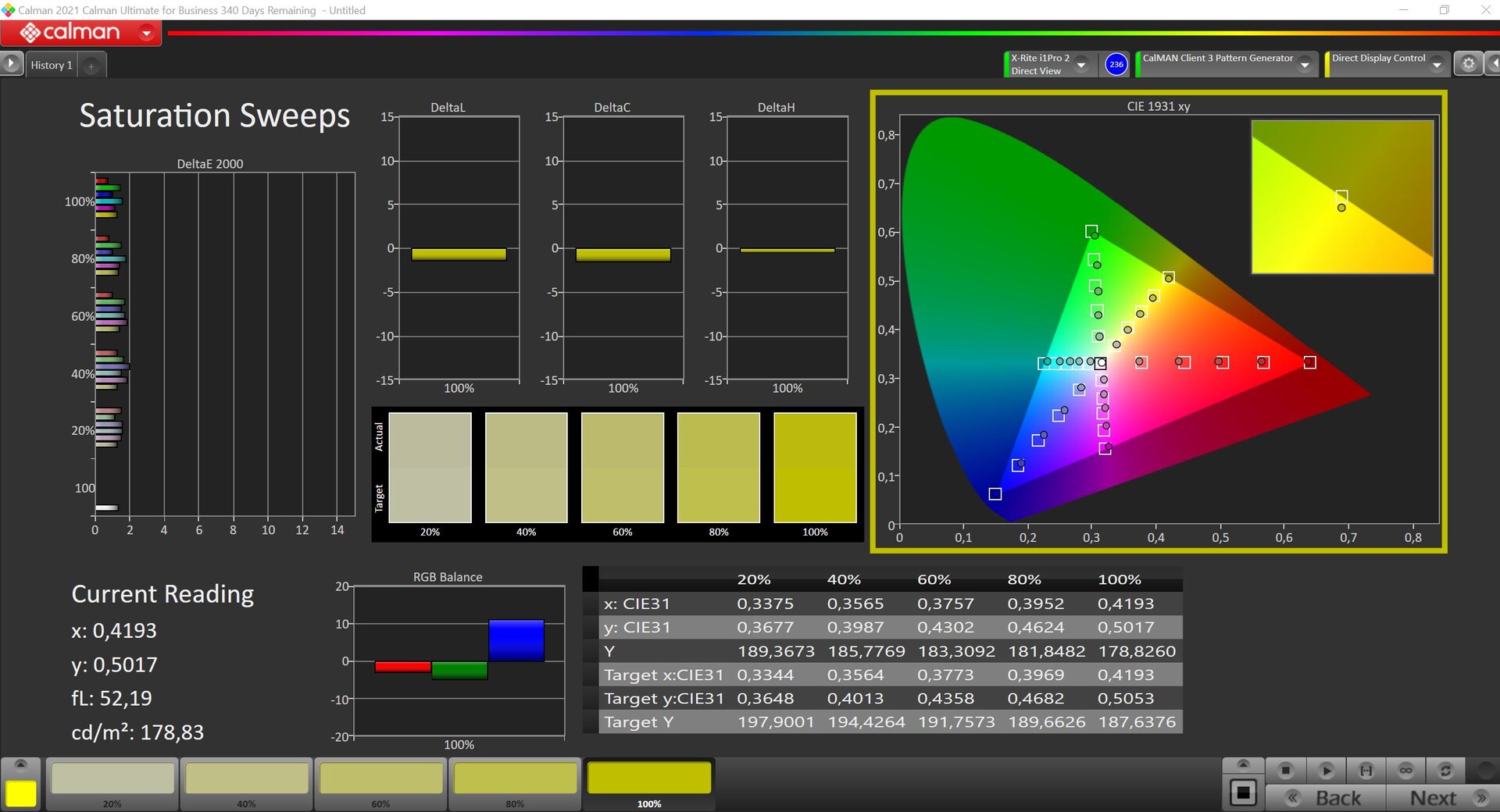 The P3 profile is already very accurate out of the box and neither the grayscale nor the colors show DeltaE2000 deviations of more than 3 compared to the P3 reference color space, so a calibration by the user is not necessary. Only the color temperature is slightly too warm. We could not improve the image quality any further with our own calibration, so we do not offer a corresponding profile at this point.
