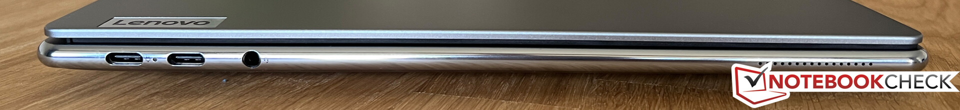 The port situation of the Yoga Slim 7 is very similar to the more expensive Yoga Slim 9 and you only get USB-C ports. The two connectors on the left side support USB 4 with up to 40 Gbps and the one on the right side USB 3.2 Gen.2 with 10 Gbps. All three ports support power delivery as well as DisplayPort connectivity. However, this means you will probably need some adapters from time to time. The Yoga Pro 7 with additional HDMI and USB-A definitely has an advantage in this respect. Contrary to the Yoga Slim 9 there is no USB hub in the box of the Slim 7.