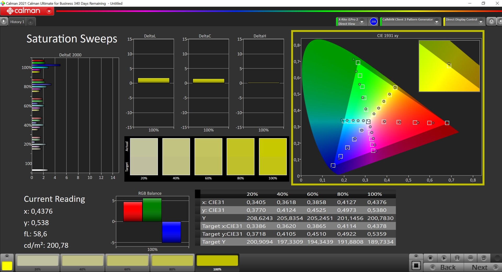 We use the professional CalMAN software in combination with the X-Rite i1 Pro 2 spectrophotometer for our analysis. The preloaded Vantage app offers four different color profiles: Default, sRGB, P3, AdobeRGB. The default profile is active by default, but colors are a bit oversaturated. The display is supposed to cover the P3 color gamut, so we used the corresponding P3 profile for our rating.