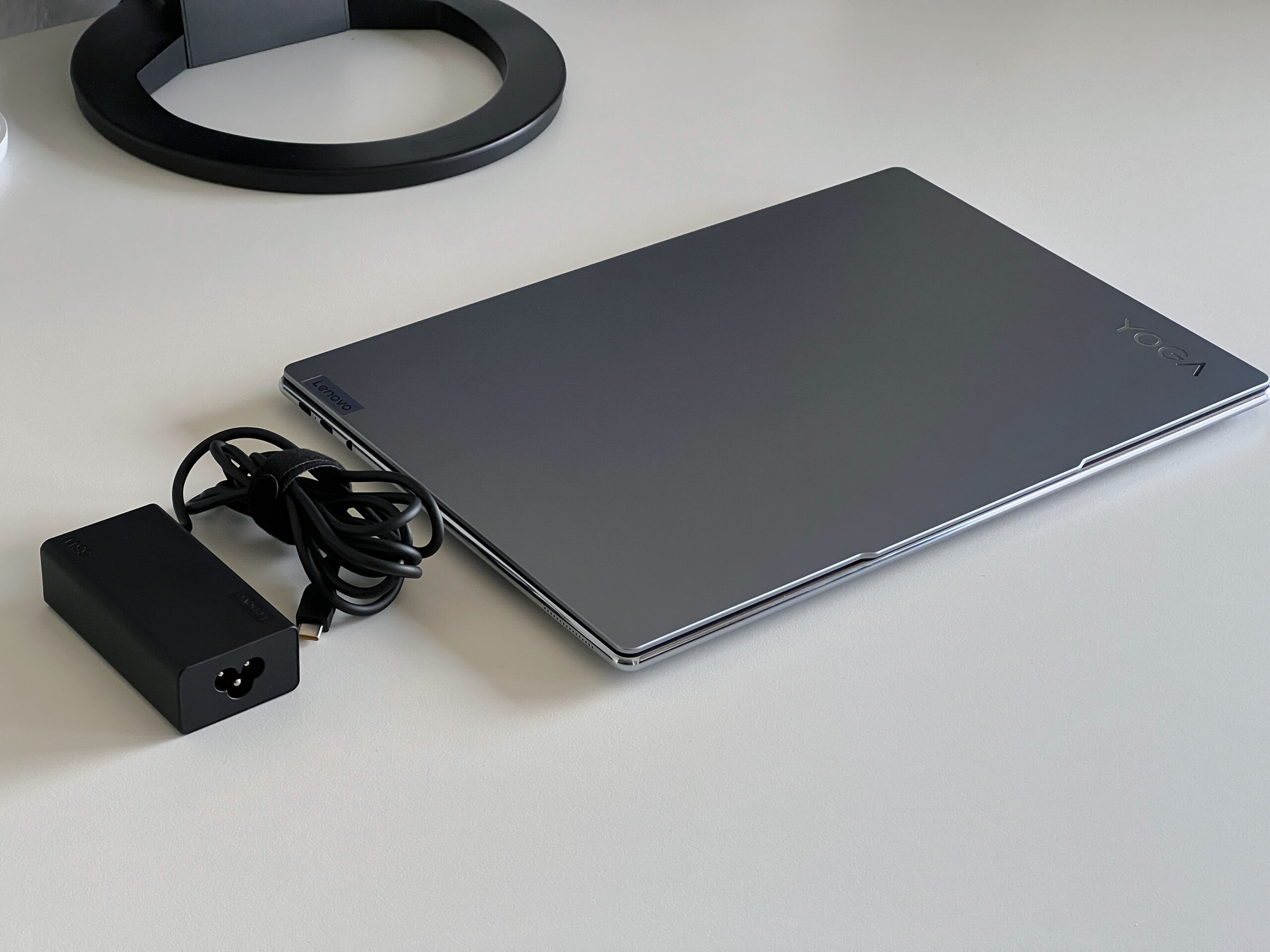 At just 13.9 millimeters, the new Yoga Slim 7 14 is one of the thinnest devices within our comparison group and is only beaten the current MacBook Air M2. The situation changes a bit for the footprint and the review unit as well as the Yoga Pro 7 are the biggest devices here since they use larger 14.5-inch screens. At 1.3 kg, the Slim 7 14 is lighter than the Yoga (Slim) Pro 7 and is once again only beaten by the 13.6-inch MacBook Air M2. The 65W power adapter tips the scale at 312 grams.