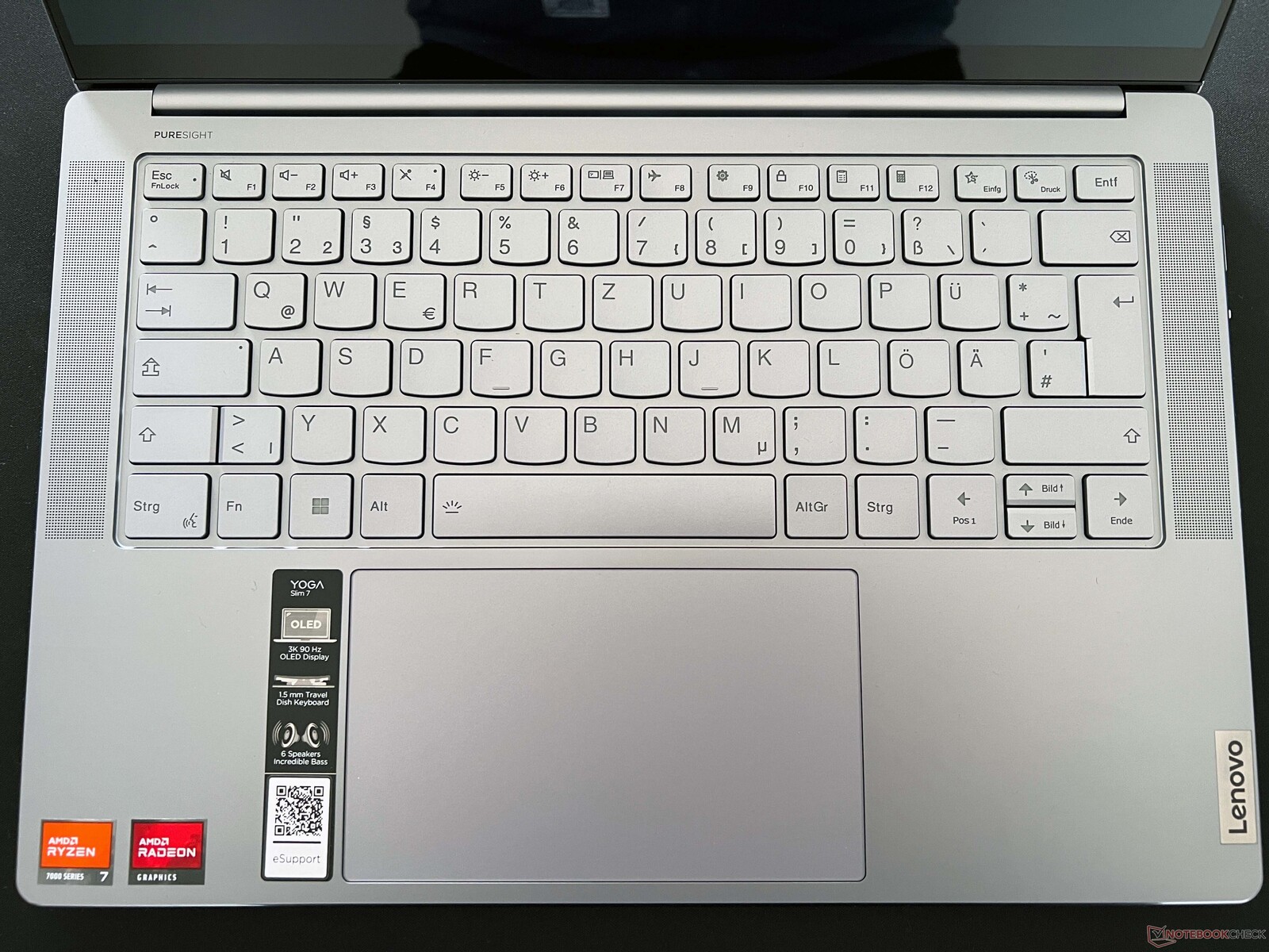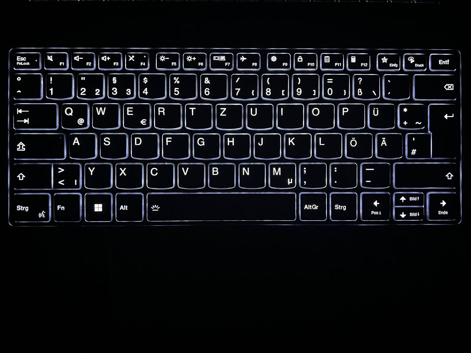 The typing experience itself is very comfortable with 1.5 mm key travel and precise key strokes. The keyboard is also very quiet, only the larger space bar is a bit louder. Like on the Yoga Pro 7, this is also a very good keyboard and it is no problem to type longer texts.