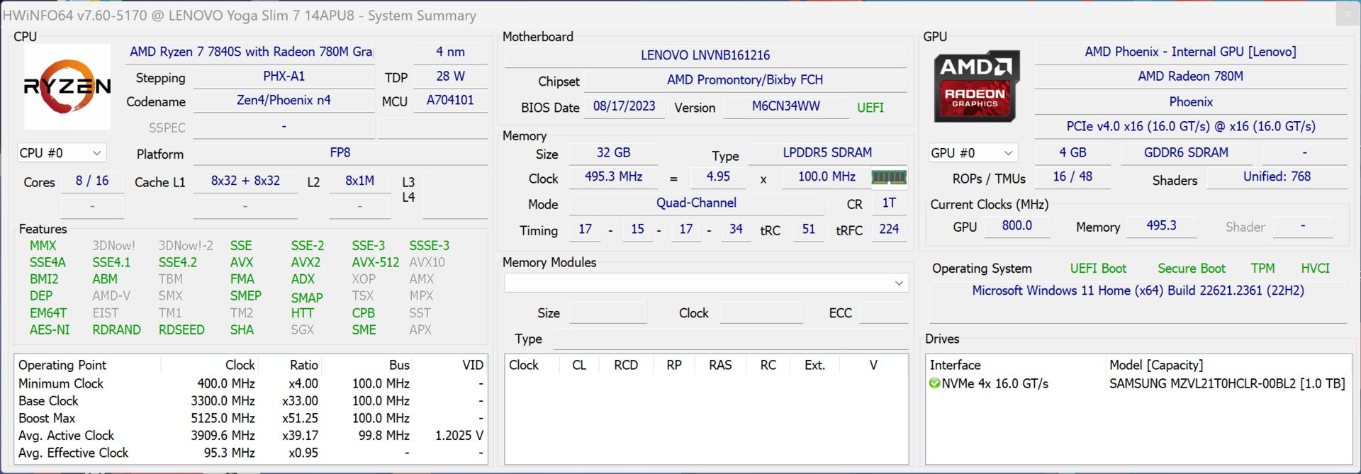 | Lenovo Yoga Slim 7 14APU G8 R7 7840S, Radeon 780M, Samsung PM9A1 MZVL21T0HCLR, OLED, 2944x1840, 14.5" | Schenker Vision 14 2023 i7-13700H, Iris Xe G7 96EUs, Samsung 990 Pro 1 TB, IPS, 2880x1800, 14" | Huawei MateBook X Pro 2023 i7-1360P, Iris Xe G7 96EUs, , IPS, 3120x2080, 14.2" | Lenovo Yoga Pro 7 14ARP G8 R7 7735HS, Radeon 680M, Samsung PM9A1 MZVL21T0HCLR, IPS, 2560x1600, 14.5" | Apple MacBook Air M2 10C GPU M2, M2 10-Core GPU, Apple SSD AP1024Z, IPS, 2560x1664, 13.6" | Lenovo Yoga Slim 9 14IAP7 i7-1280P, Iris Xe G7 96EUs, Samsung PM9B1 1024GB MZAL41T0HBLB, OLED, 2880x1800, 14" | Average AMD Radeon 780M | Average of class Subnotebook | |