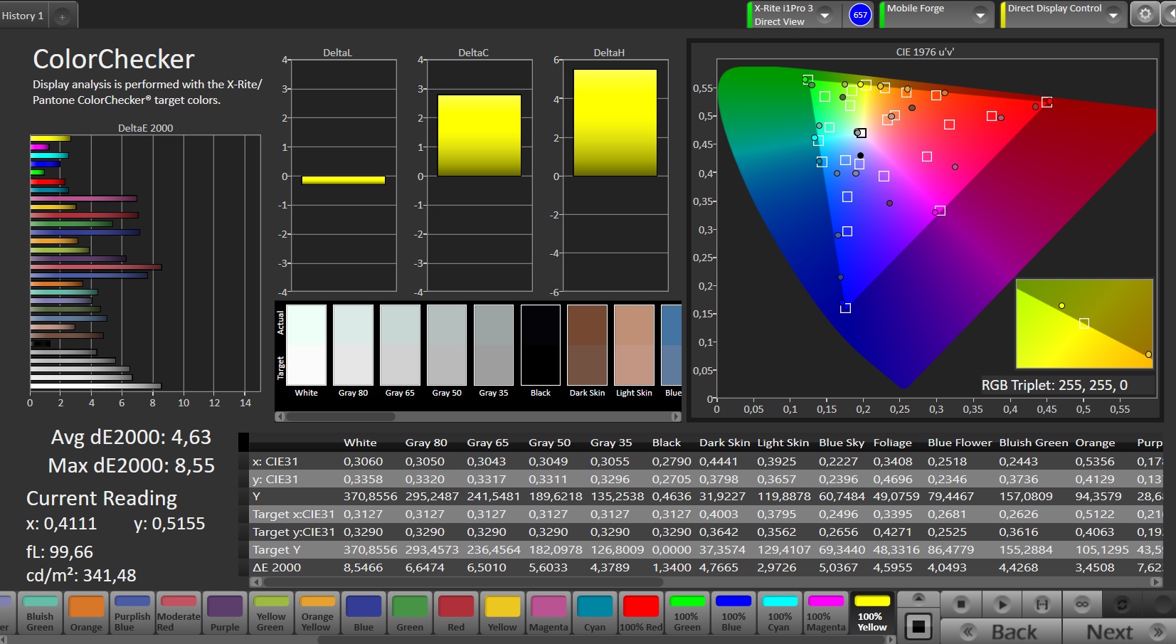We run the CalMAN software in our test lab and evaluate the image reproduction using the spectral photometer. We determine that there are slightly higher color deviations in the default settings as well as the predefined "bright" second color mode than in other high-end tablets. Particularly the reproduction of white color shows a green tint.