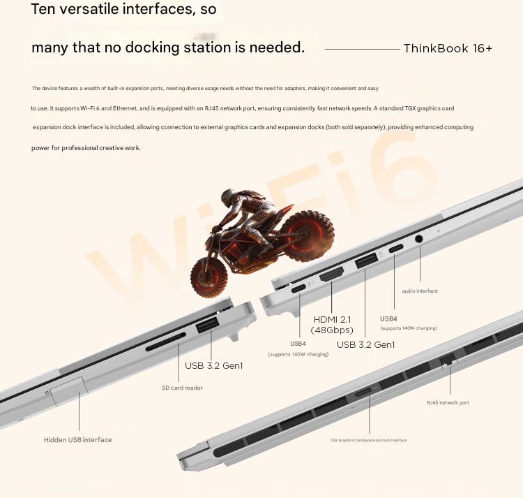 Other than the display, the rest of the specs for the two AMD-powered 2026 ThinkBook 16 Plus and 14 Plus are identical. Both have support for up to 8TB of PCIe 4.0 storage, and Lenovo has paired the AMD APU with 32GB of LPDDR5x RAM running at 7500MT/s. In addition to the TGX port, the laptops have the following ports: