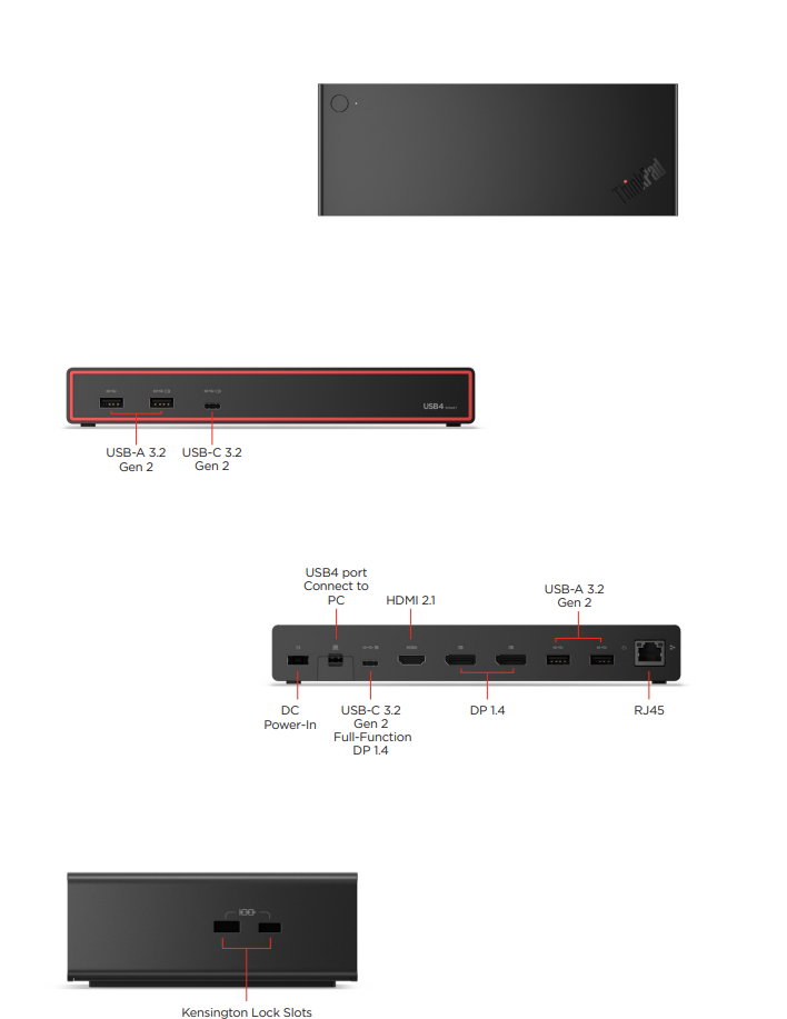 Lastly, the ThinkPad USB4 Smart Dock 5500 replaces the input Thunderbolt 4.0 with a USB 4 port, and that's the only USB 4.0 port on the dock. There's a USB 3.2 Type-C port apiece at the front and back. Two USB 3.2 Type-A ports are also laid out similarly. Lastly, the RJ45 Ethernet jack is downgraded to 1 Gbps, while the DP 1.4/HDMI 2.1 ports remain unchanged. USB-PD Wattage stays at 100 Watts.