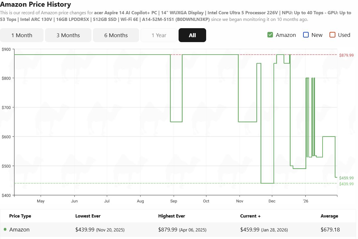 The Acer Aspire 14 AI with a Core Ultra 5 226V APU, 16 GB of LPDDR5x RAM, and 512 GB of storage is retailing for $459.99 on Amazon, a 44% discount on the full $830 list price. According to the laptop’s price history on camelcamelcamel, the current $460 price is just $20 more than the all-time low. So, the Acer Aspire 14 AI is almost down to its lowest price ever.