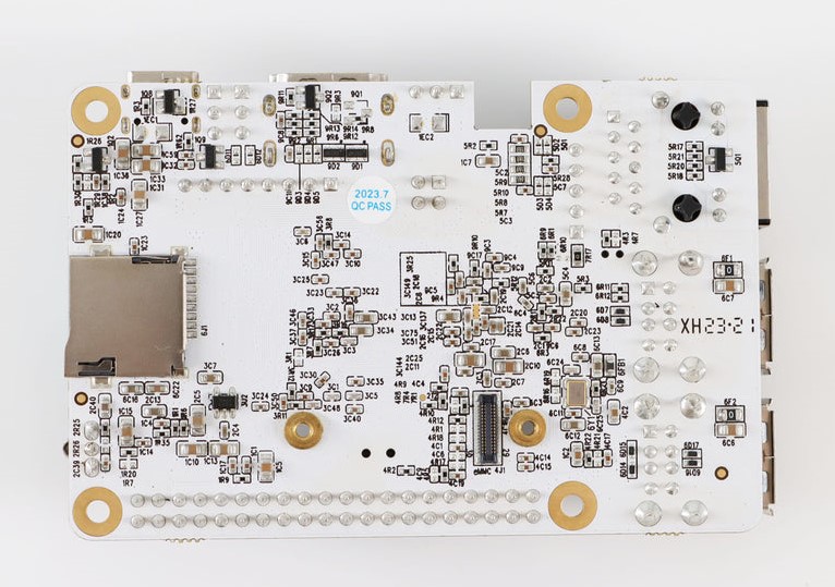 As mentioned, users can power the board through either the 5V 3A USB-C port or the Fast Ethernet (100 Mpbs) connector when paired with an HAT that enables PoE support. Other connectivity includes four 480 Mpbs USB-A ports, HDMI 2.0, a 40-pin GPIO header, an 8-pin audio header, and a 5-pin USB header that should enable the use of UVC cameras. Finally, an IR sensor is also present.
