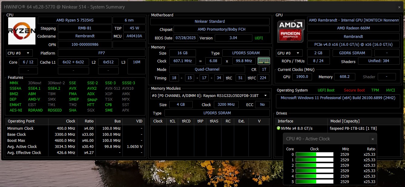 | Ninkear S14, 16+1TB AMD Ryzen 5 7535HS ⎘ AMD Radeon 660M ⎘ 16 GB Memory, 1024 GB SSD | List Price: 629€ | 1.1 kg | 15 mm | 14.00" 2240x1400 189 PPI | |
