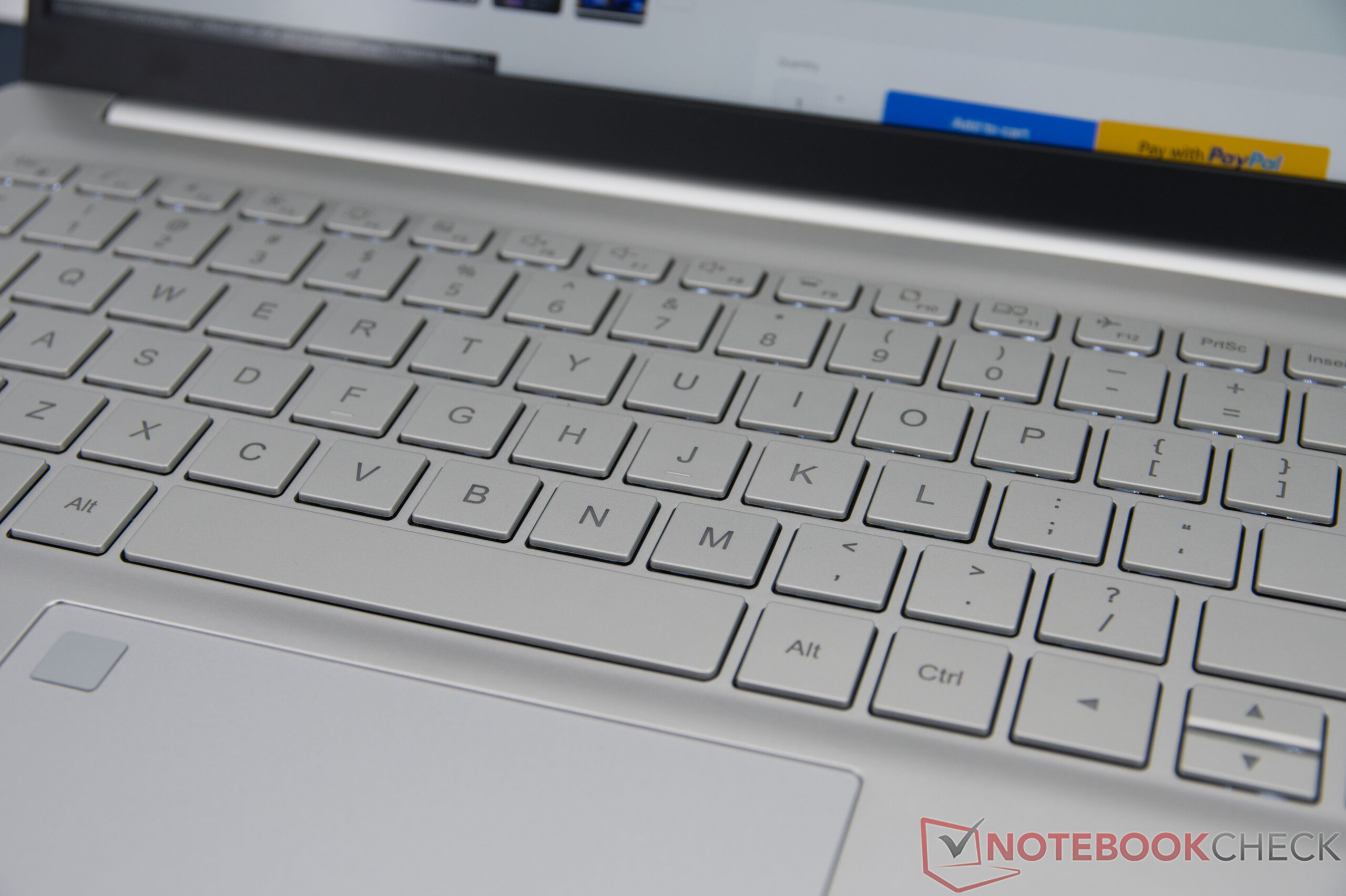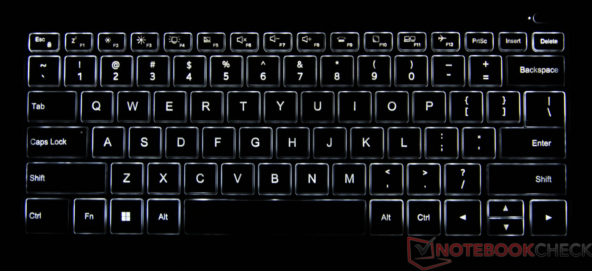 The keyboard of the Ninkear S14 offers a precise and pleasantly firm typing feel, which has a positive effect on typing behavior. Due to the design, the up and down arrow keys are only half-height, but you can get used to this. The device is only supplied with a QWERTY layout, which also has a two-stage backlight. The manufacturer includes stickers for other language layouts, but these detract from the overall appearance.