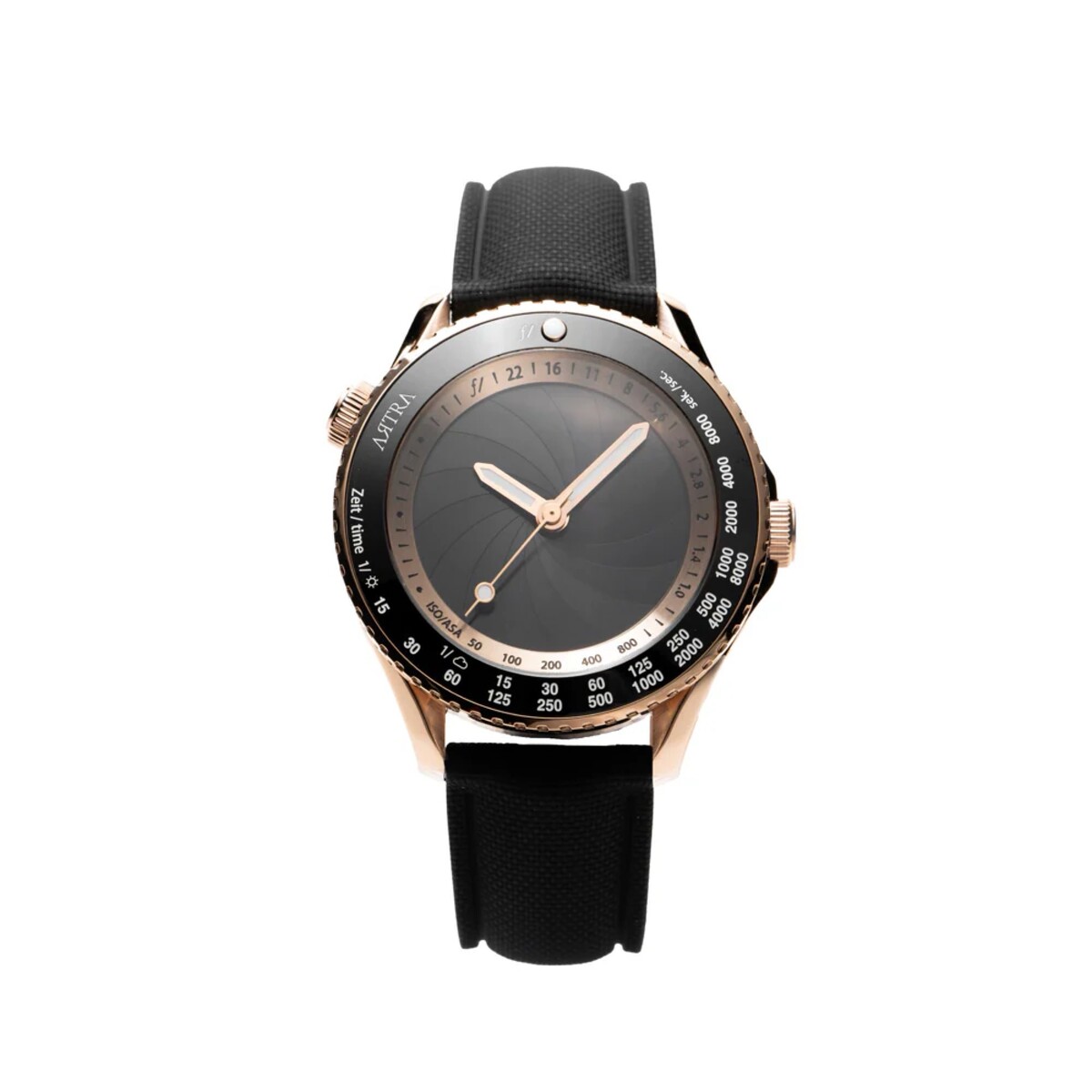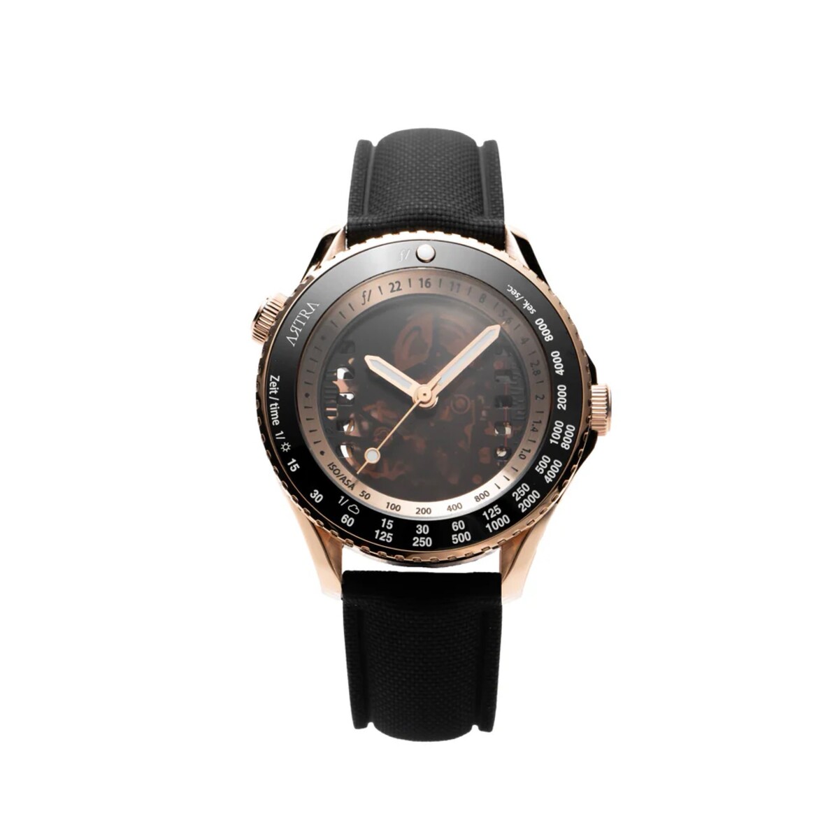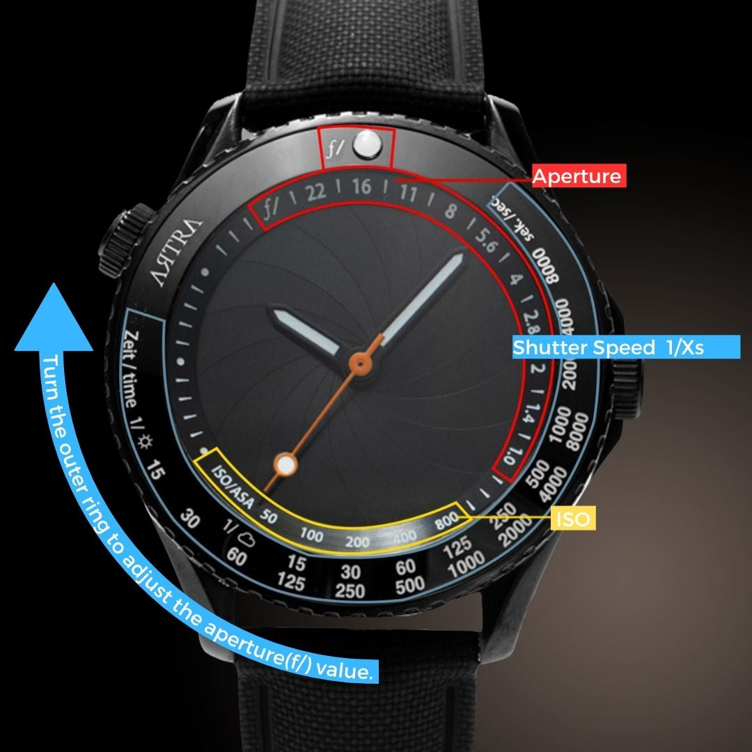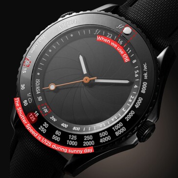 When the aperture is opened, a partially transparent dial is revealed, designed to resemble 35mm film. The transparency allows a view of the movement inside, while a window on the back of the watch provides a better view of the mechanism. Aperture markings from f/1.0 to f/16 are displayed on the left side of the case, while the bezel is marked with numbers indicating shutter speed and film ISO.