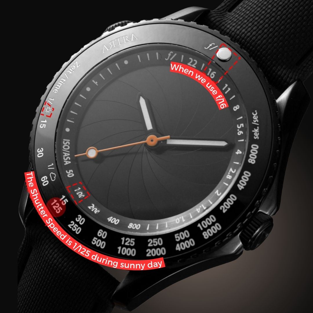 These elements not only serve a decorative purpose, but also allow the user to calculate the correct shutter speed for proper exposure. For example, reading the bezel from the inside out, one can see that at ISO 400 and f/16, the correct shutter speed is 1/500s in sunlight and 1/60s in shade. The selected aperture can be adjusted by rotating the bezel. The watch features a stainless steel case that is water-resistant up to 50 meters, and the dial is protected by sapphire crystal.