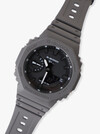 The GA-2100 is a shock resistant model with a carbon core guard structure, offering 20 ATM water resistance. It is a Casioak watch with an octagonal bezel, and a gray resin and carbon fiber casing. The Ron Herman logo is engraved on the stainless steel case back and can be found again on the black watch face. There are also white accents and neobrite elements on the face and a matching gray resin band.