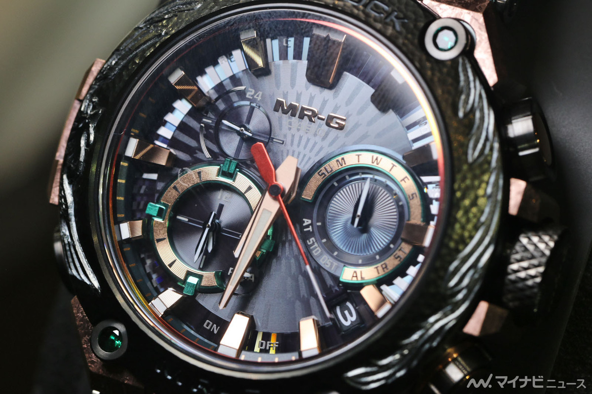 Photos of the Casio G-Shock MRG-B2000KT-3A, shared by MyNews Navi from an event in Japan, provide a fresh look at this premium, analog timepiece. The dial is even more striking IRL than in the marketing images, with a shinier arrowhead pattern and highly reflective minute indexes. Through these images, you can also appreciate the ribbed finish on the hour indexes and indicator rings in more detail. The pictures also capture the green DLC coating on the hand-engraved bezel, with various shades of green and yellow seen as it catches the light.