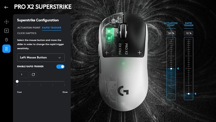 Logitech justifies the steep price tag not only with the mouse's low weight of 61 grams, the 44,000 DPI Hero 2 sensor and the wireless polling rate of 8,000 Hz via the included Logitech Lightspeed USB dongle, but primarily with its "Haptic Inductive Trigger System (HITS)." Logitech replaces the classic micro-switches in the left and right mouse buttons with an inductive system that detects how far the button has been pressed, but without a click.