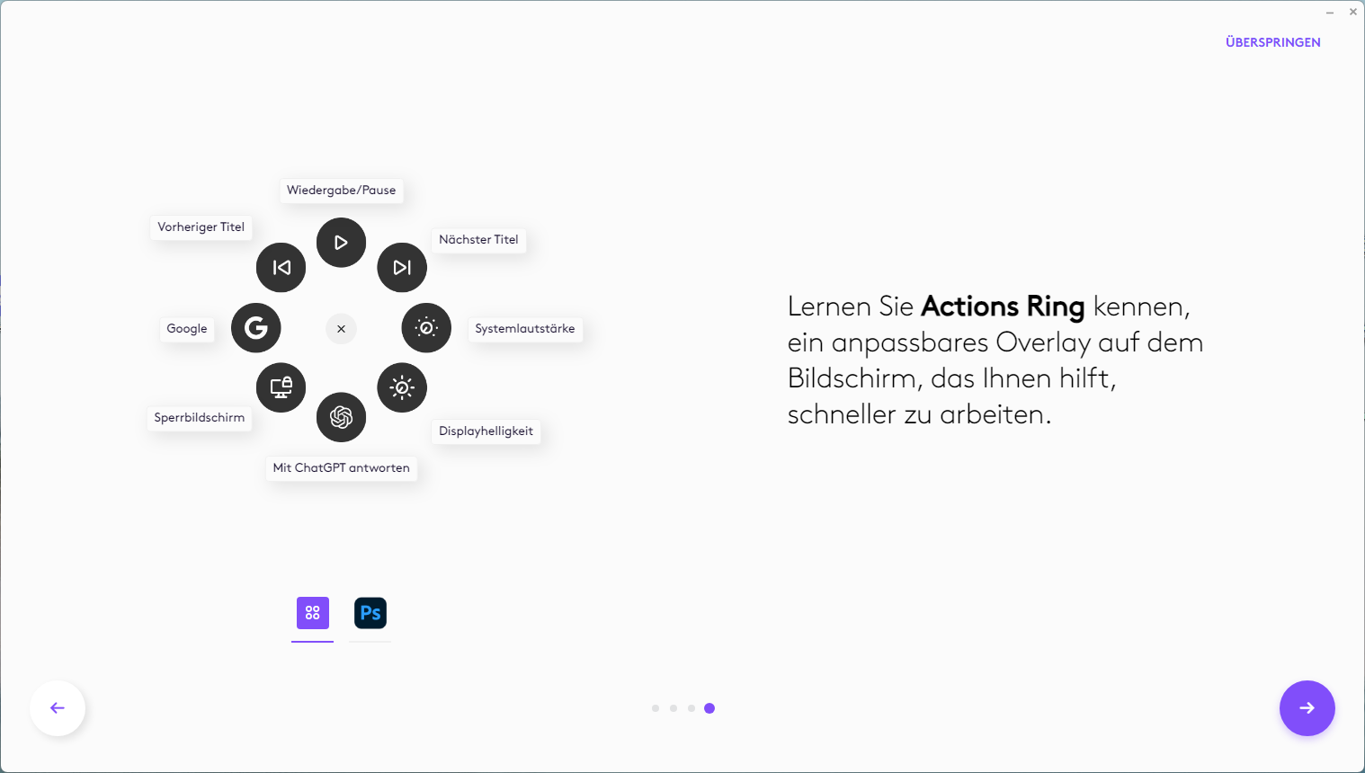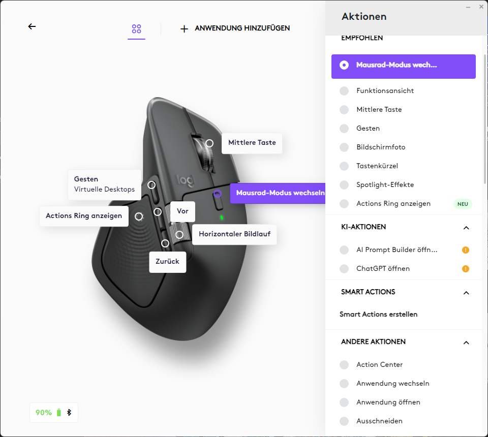 The basic connection is established within seconds, so the mouse is ready to use immediately. To enjoy the full range of features, we recommend installing the free Logi Options+ software, which can be used to configure the Action Ring in particular. The circular menu on this ring allows quick access to up to eight programmable shortcuts, which make navigating and working in complex applications such as Adobe Photoshop, Zoom, or Office noticeably easier. The software design is currently still in the beta phase, but has already proven to be very reliable during the review.