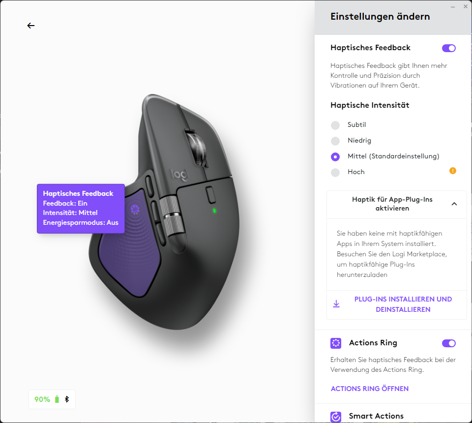 With its haptic feedback, the Logitech MX Master 4 offers a feature that has previously been seen mainly in smartphones and high-end trackpads. A vibration motor beneath the thumb rest provides noticeable feedback during certain actions, such as navigating to the edge of the screen, switching between applications, or activating the new Action Ring. The intensity of the vibration can be individually adjusted in four levels or completely deactivated.