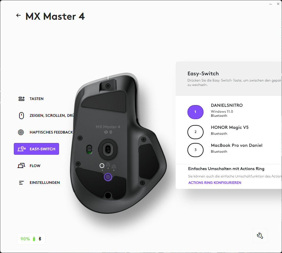 Setting up the MX Master 4 is quick and easy. The mouse can be connected either via Bluetooth or the included Logi Bolt USB-C receiver, which provides a stable, secure wireless connection with a range of several meters. Users can pair up to three devices and switch between them effortlessly using a button on the bottom of the mouse.