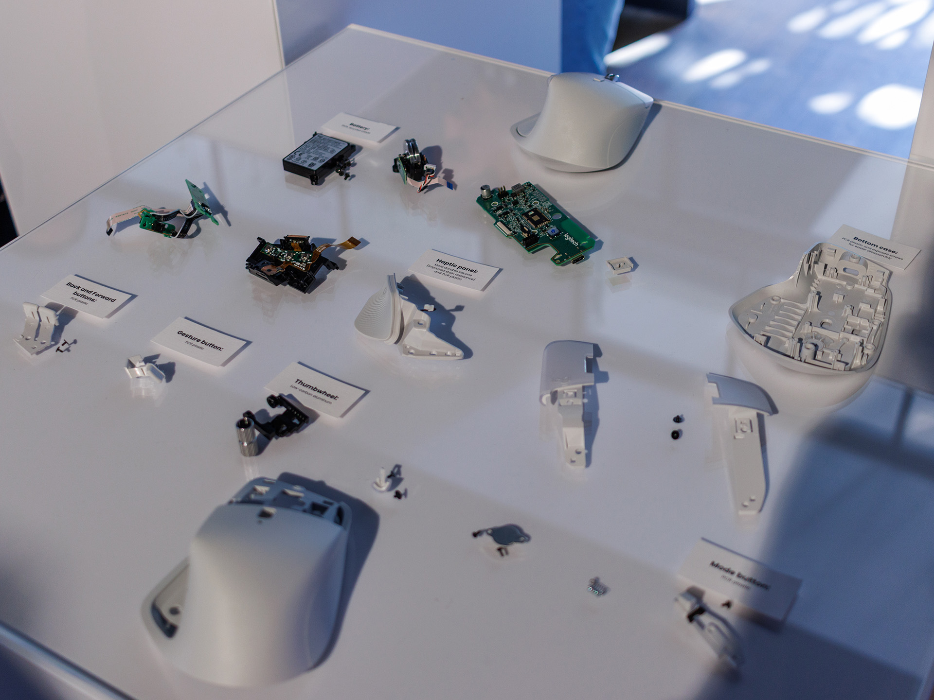 The sensor operates at up to 8,000 DPI and can be used reliably even on glass surfaces. Screws for disassembly and possible repair are easily accessible, and Logitech plans to offer replacement batteries, which supports the sustainable use concept.
