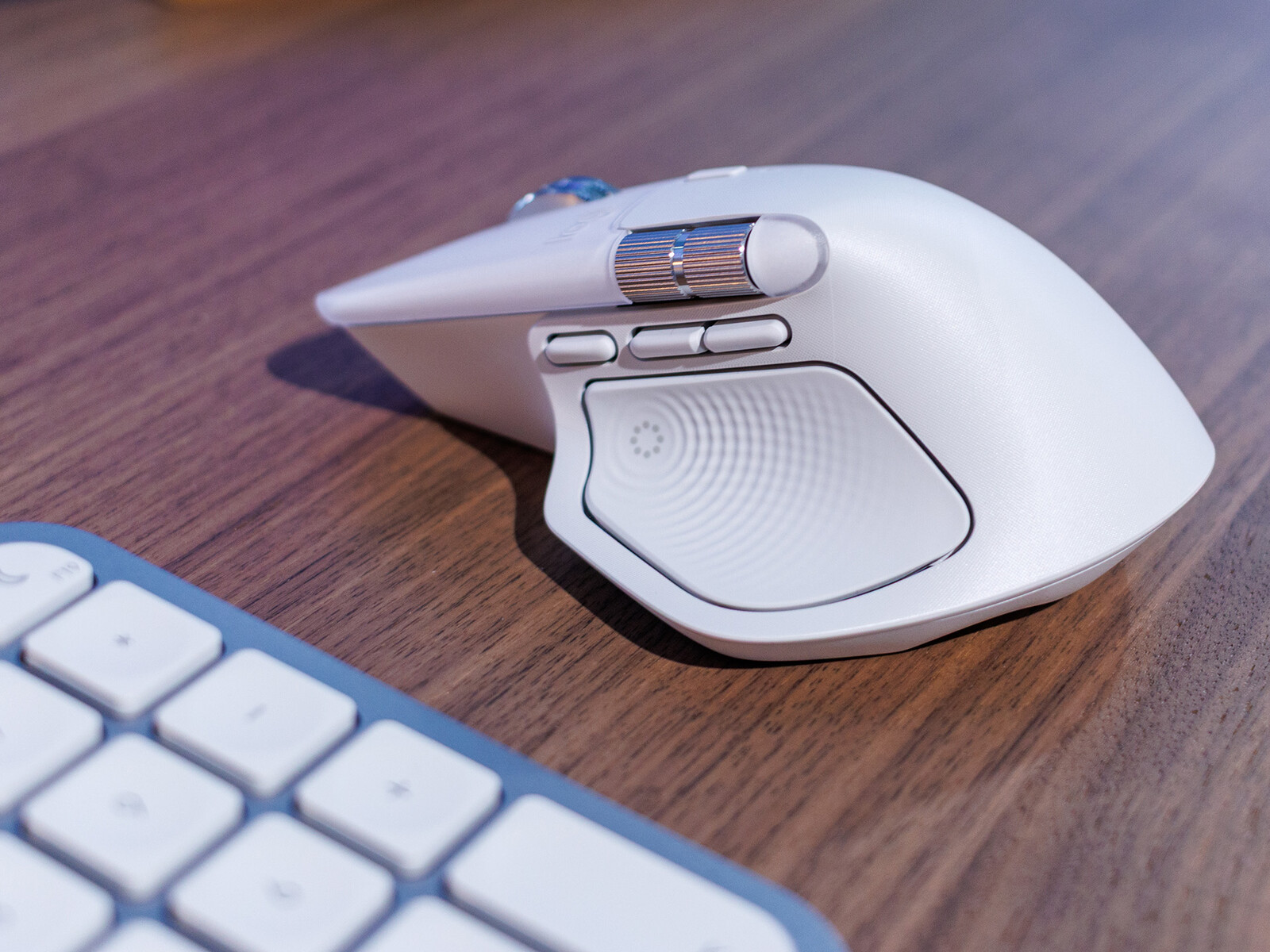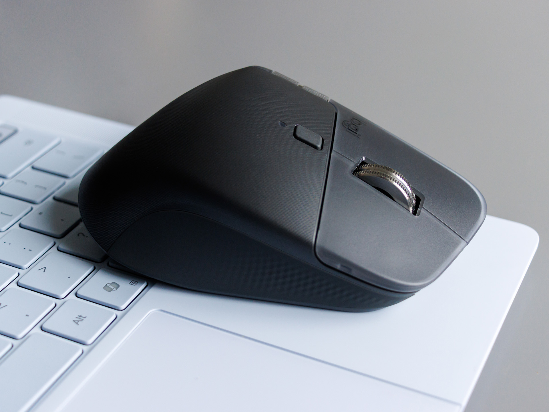 The Logitech MX Master 4 features high-quality materials: the housing is largely made of recycled plastic, while the thumb wheel and main scroll wheel are crafted from robust aluminum.