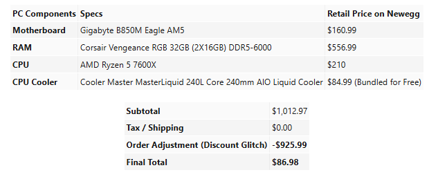 The Newegg $87 Combo Configurator Glitch: Components and Pricing Breakdown