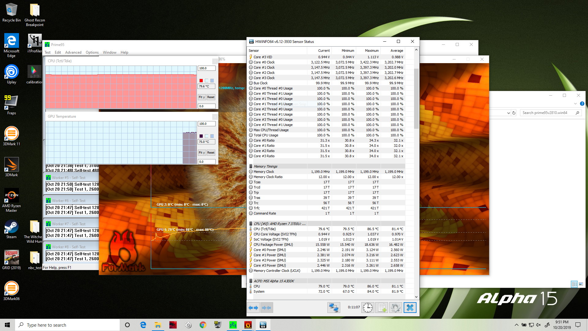 Our stress test also did not cause the Alpha 15 to thermal throttle. The device was happy to keep its CPU and GPU core temperatures at 86 °C (~187 °F) throughout, which is also over 10 °C (~18 °F) shy of their critical operating temperatures.