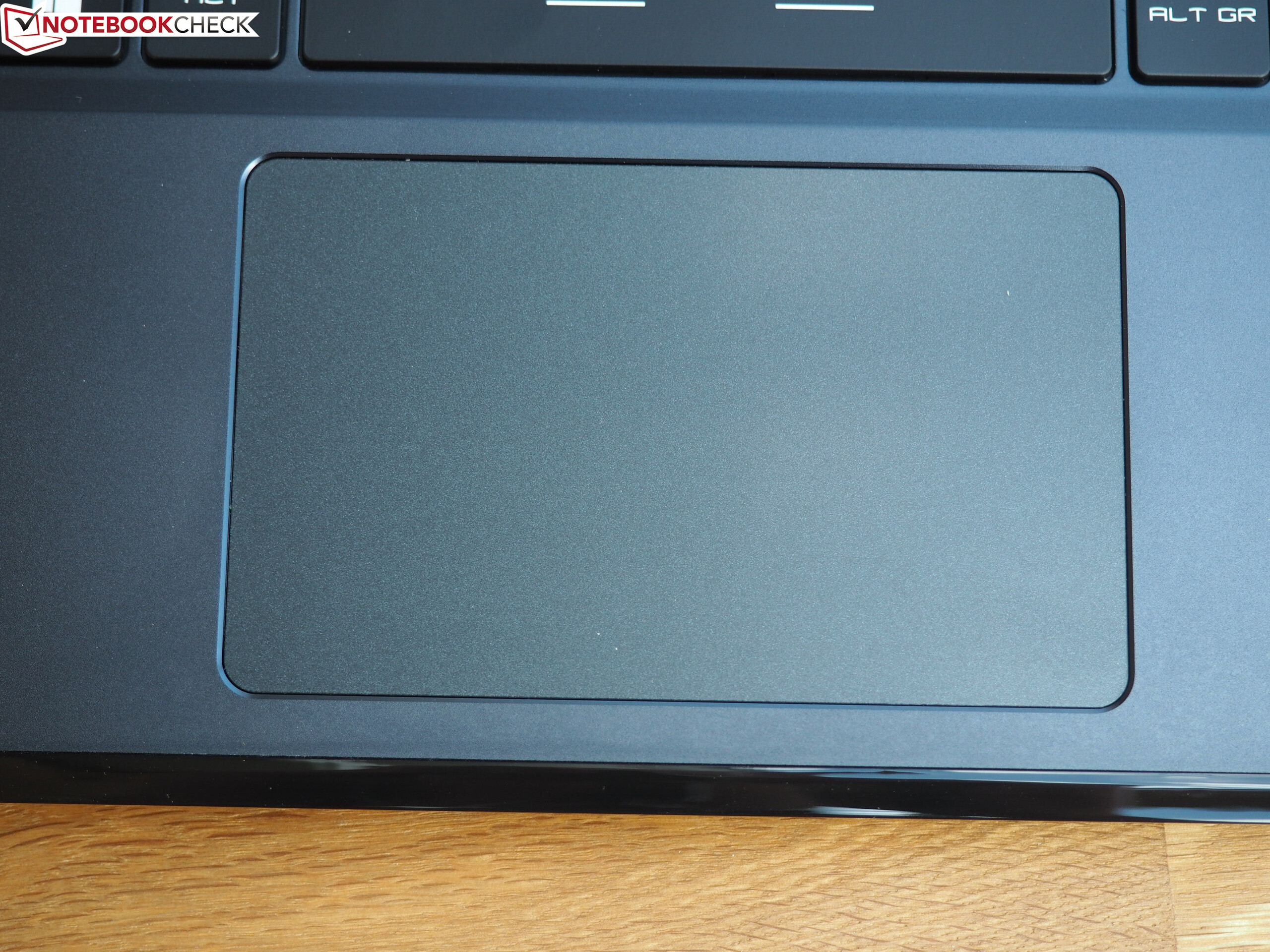 With a width of 10.5 cm and a height of 6.5 cm, the touchpad is neatly dimensioned for a 15-inch device. The smooth finish ensures quick inputs, which are usually recognized cleanly and reliably. The same applies to the multi-touch support. Content can be comfortably zoomed and scrolled with a two-finger gesture. Since dedicated mouse buttons are missing, left and right clicks are triggered by pressing the bottom surface.