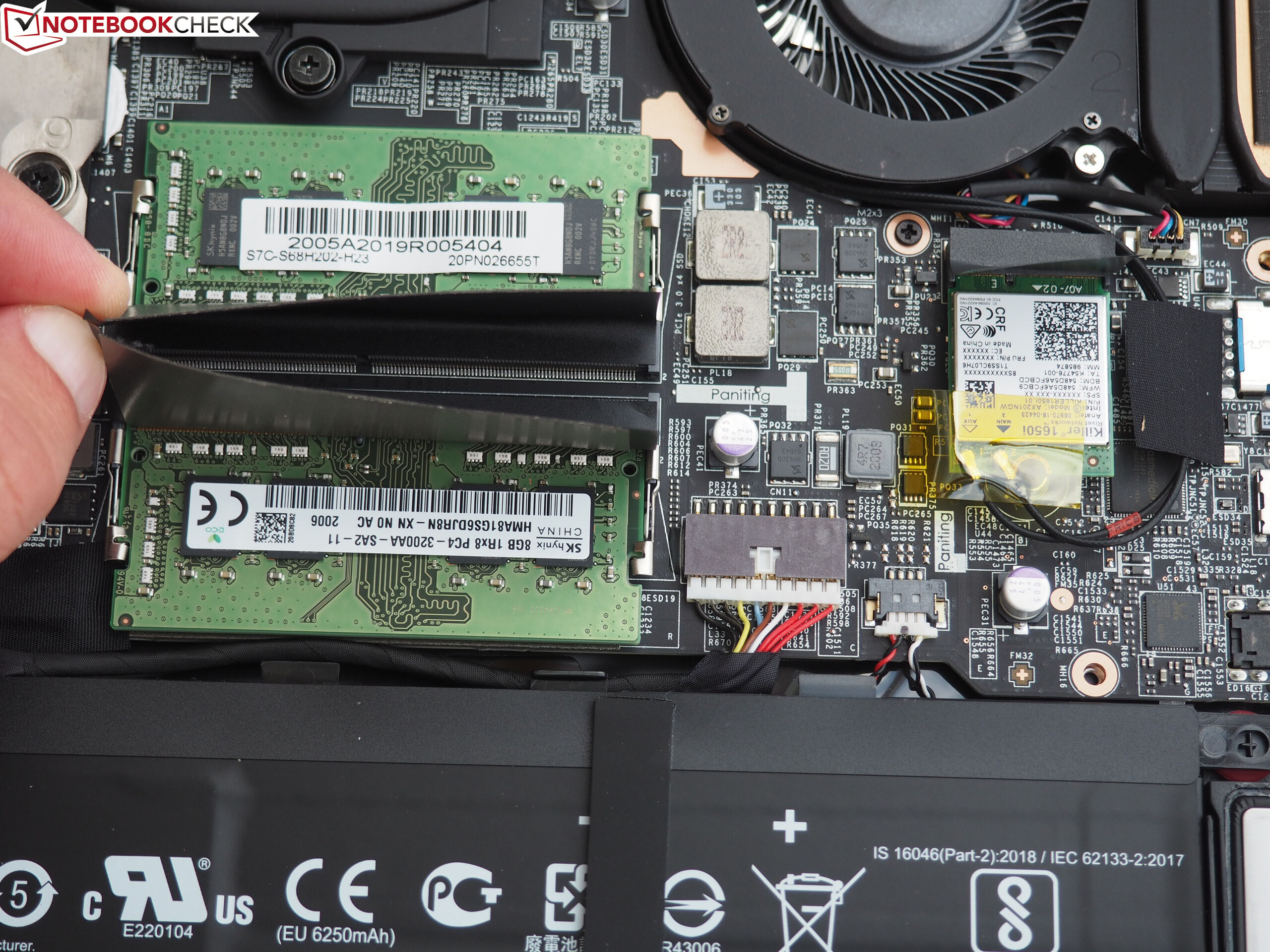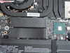 Anyway, the wireless module, two SO-DIMM banks and two M.2 slots of type 2280 (1x free) wait inside the case. Not surprisingly, the cooling system consists of two fans and several heatpipes. The front area of the GE66 is taken over by the huge battery.