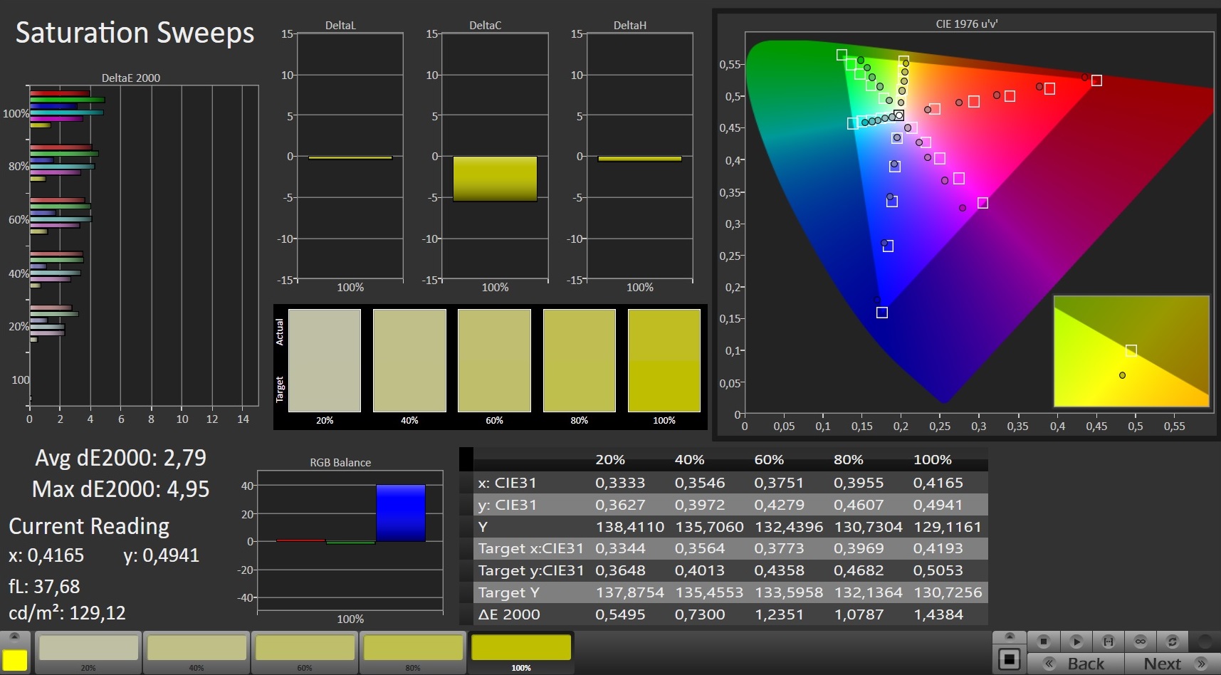 The CalMAN analysis also shows that colors are displayed with a DeltaE 2000 deviation of 5.66. This value can be reduced to 2.7 through calibration. The corresponding ICC file can be downloaded in the top right window next to the screen illumination graphic.