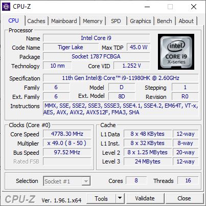 The Intel Core i9-11980HK used here is a processor with eight cores that can process up to 16 tasks simultaneously. The clock rates are between 2.6 and 5 GHz, with the actual performance depending on the cooling system and the predefined TDP. MSI configures the latter with a short-term value (PL2) of 200 watts and a long-term value (PL1) of 91.75 watts.