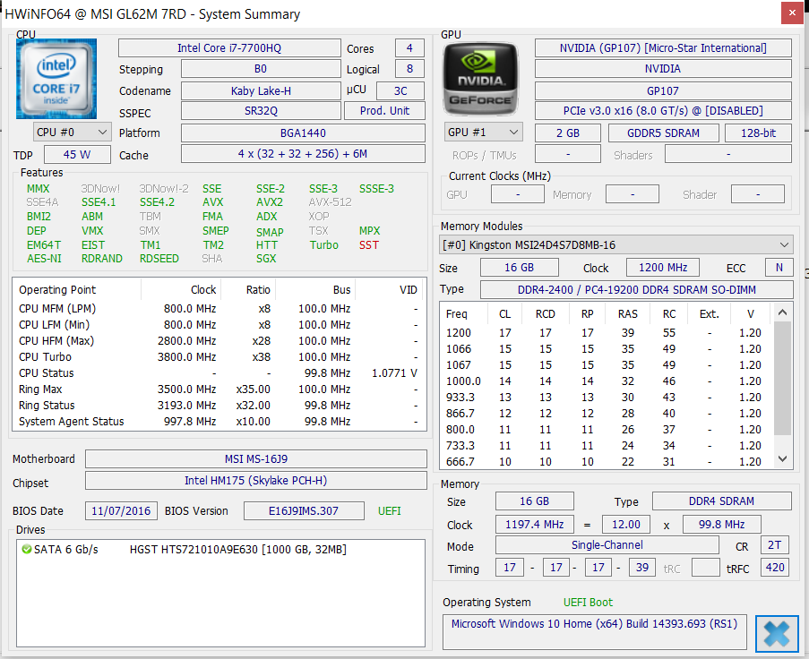 The GL62M is powered by a Core i7-7700HQ (Kaby Lake) quad core processor. The CPU's base clock is 2.8 GHz. Thanks to Turbo, the clock rate can increase to 3.4 GHz (four cores), 3.6 GHz (two cores), and 3.8 GHz (one core). The clock rates are 200 to 300 MHz higher than the direct Skylake predecessor's (Core i7-6700HQ). The higher clock rates ensure better results in the benchmarks. The performance gain is not due to changes in the architecture, since Kaby Lake and Skylake hardly differ from a technical point of view. Both processors feature a TDP of 45 watts.