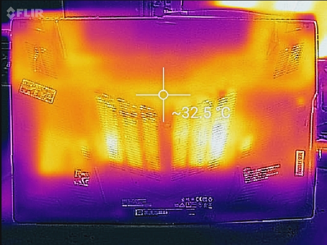 Despite the comparatively aggressive thermal management with well-controlled hardware temperatures, the surface areas do become quite warm. Both our stress test with Prime95 and Furmark and the Witcher 3 test increase the temperature to a maximum of 48 C on the bottom in the middle quadrant. Many competing systems get hotter though: the HP Omen 15 reaches up to 54 C under the same conditions. The WASD key area only gets moderately warm at about 35 C when gaming and the palm rests as well as the touchpad stay cool to the touch even under sustained heavy loads. The new and improved cooling system - MSI now employs seven heat pipes and two additional exhaust vents - keeps the palm rests markedly cooler compared to the predecessor GP62, which could reach 40 C in the touchpad area.