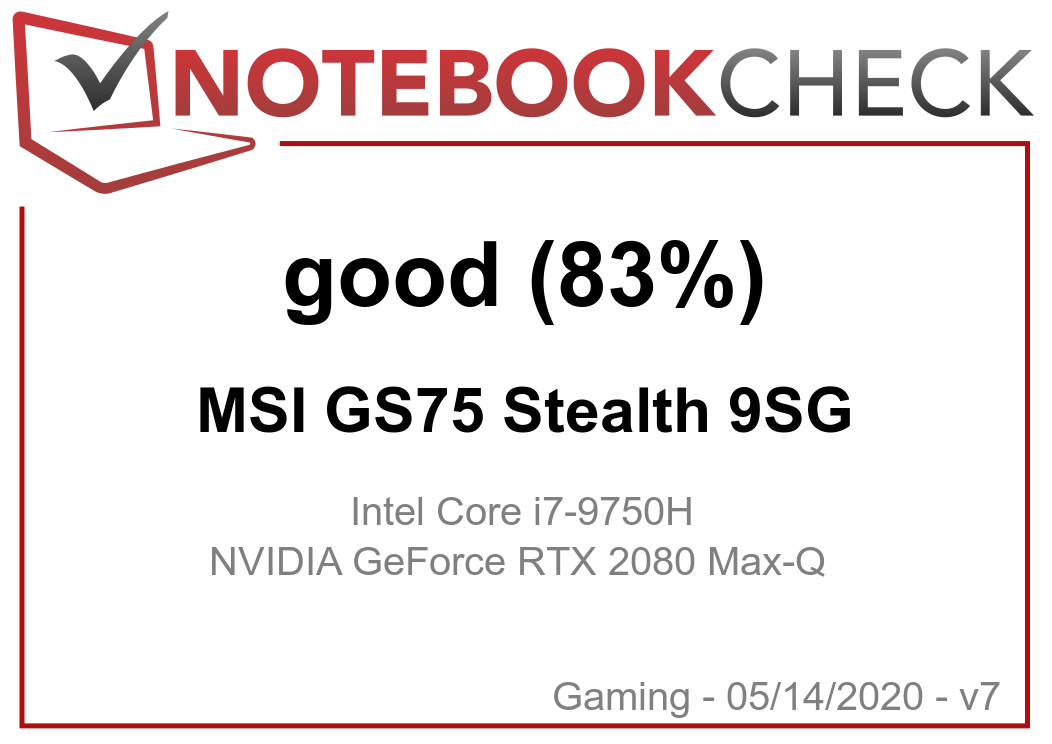 | MSI GS75 Stealth 9SG i7-9750H, GeForce RTX 2080 Max-Q | Schenker XMG Neo 17 i7-8750H, GeForce RTX 2070 Mobile | Dell G7 17 7790 i7-8750H, GeForce RTX 2070 Max-Q | Alienware m17 P37E i9-8950HK, GeForce RTX 2080 Max-Q | Asus Zephyrus S GX701GX i7-8750H, GeForce RTX 2080 Max-Q | Lenovo Legion Y740-17ICH i7-8750H, GeForce RTX 2080 Max-Q | Average of class Gaming | |