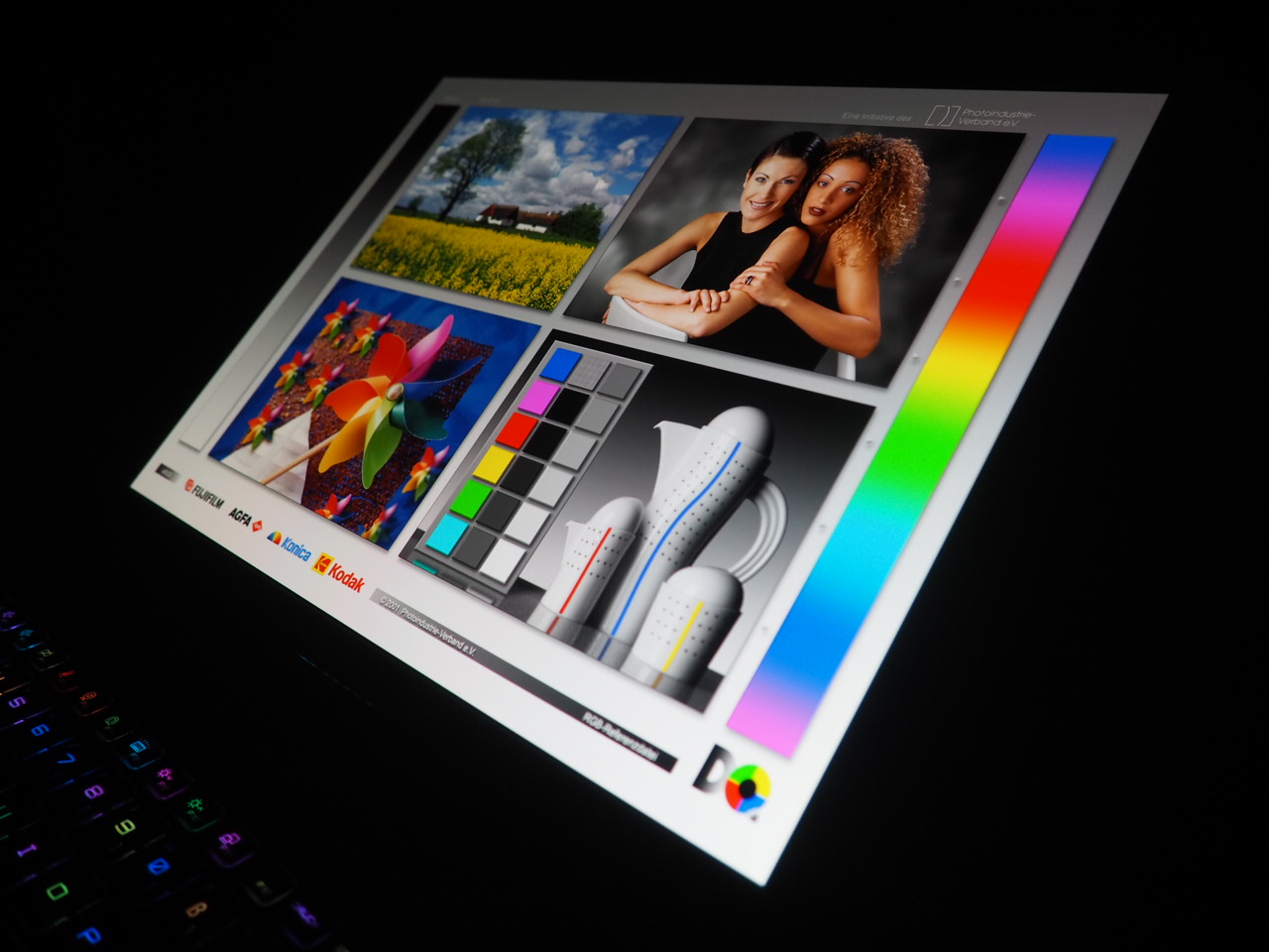 The screen also delivers a good to very good performance in various aspects. With almost 100% coverage of sRGB or DCI-P3 and 88% coverage of AdobeRGB, it excels in color space. Additionally, the color accuracy is first-class, eliminating the need for calibration, unlike some competitors. The display's outstanding black level, nearly 0.0 cd/m², contributes to an impressive contrast characteristic of OLEDs, surpassing traditional IPS panels. The same superiority extends to viewing angle stability and response time, making OLED notebooks the current reference in these aspects.
