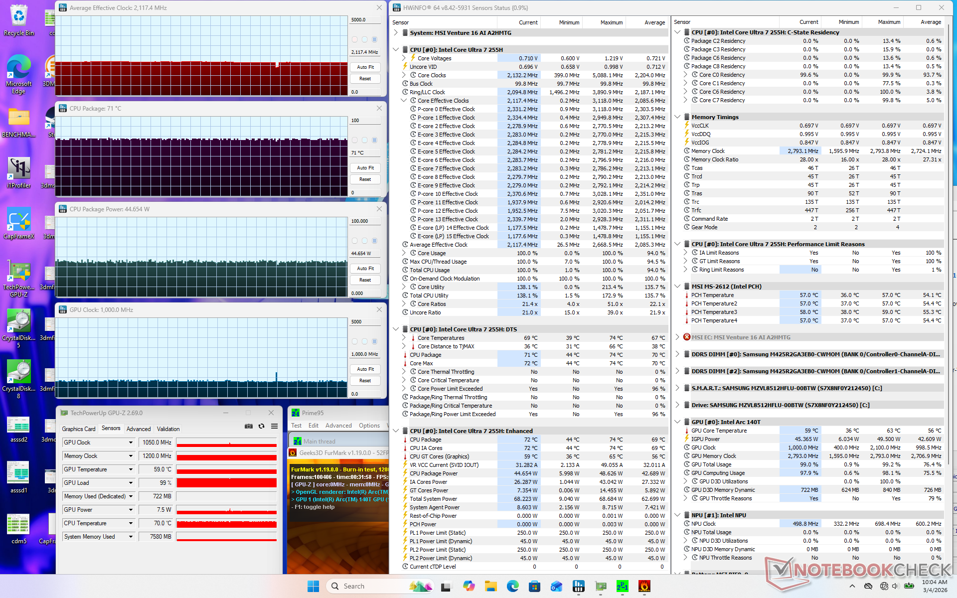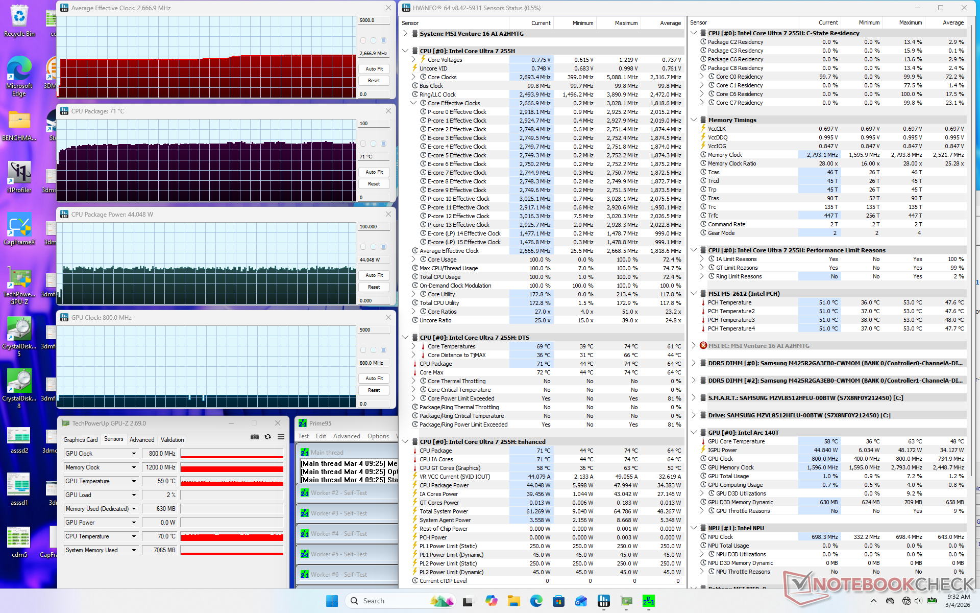 The CPU would stabilize at 2.7 GHz, 71 C, and 44 W when initiating Prime95 stress. Core temperature would remain in the low 70 C range even when under stress compared to the mid 80 C range on the Prestige 16 equipped with a similar Core H-series CPU.